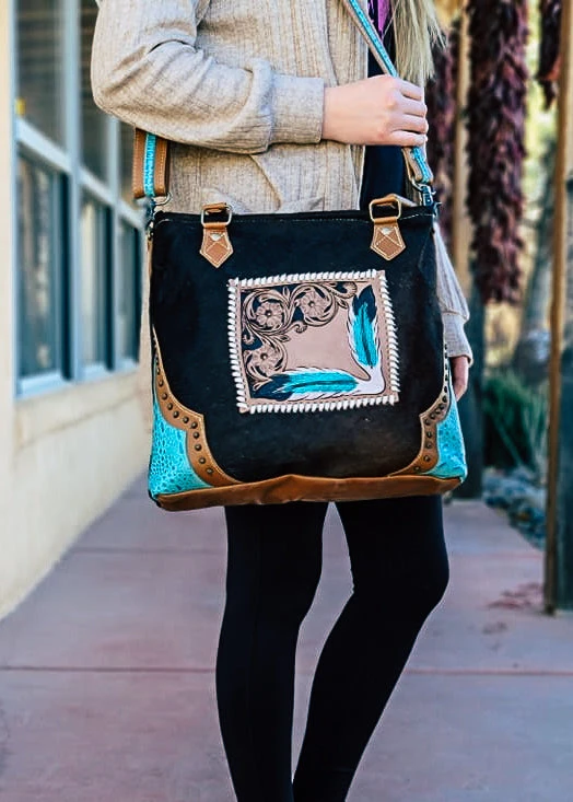 - Elevate your style with the Myra Dark Cowhide Turquoise & Feathers Handbag. This unique piece combines elegance with a bohemian touch, featuring turquoise accents and feather details.