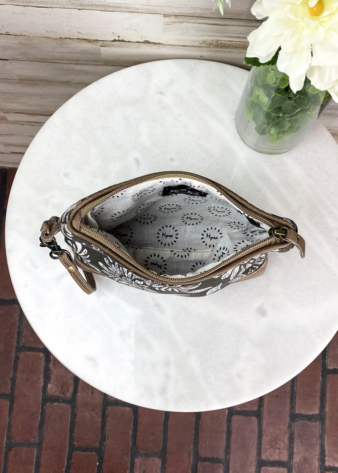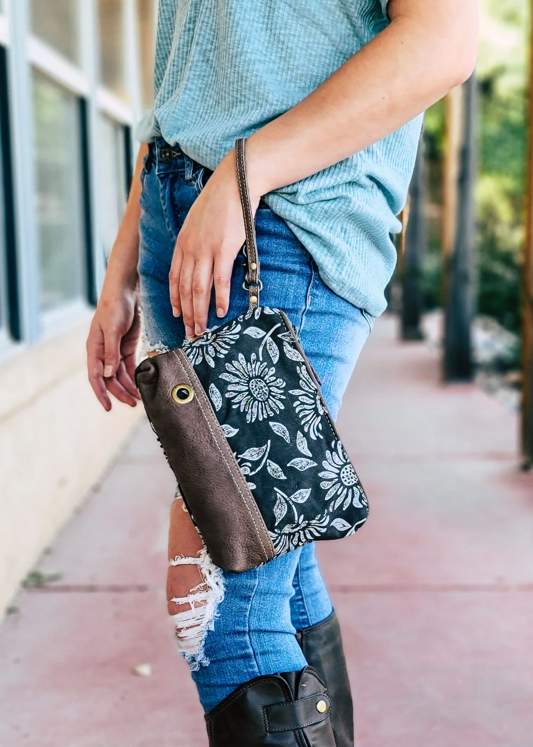 - Crafted with a distressed sunflower design, this wristlet adds a touch of bohemian charm to your look. The compact size makes it ideal for everyday use, travel, or as a chic addition to your handbag collection.