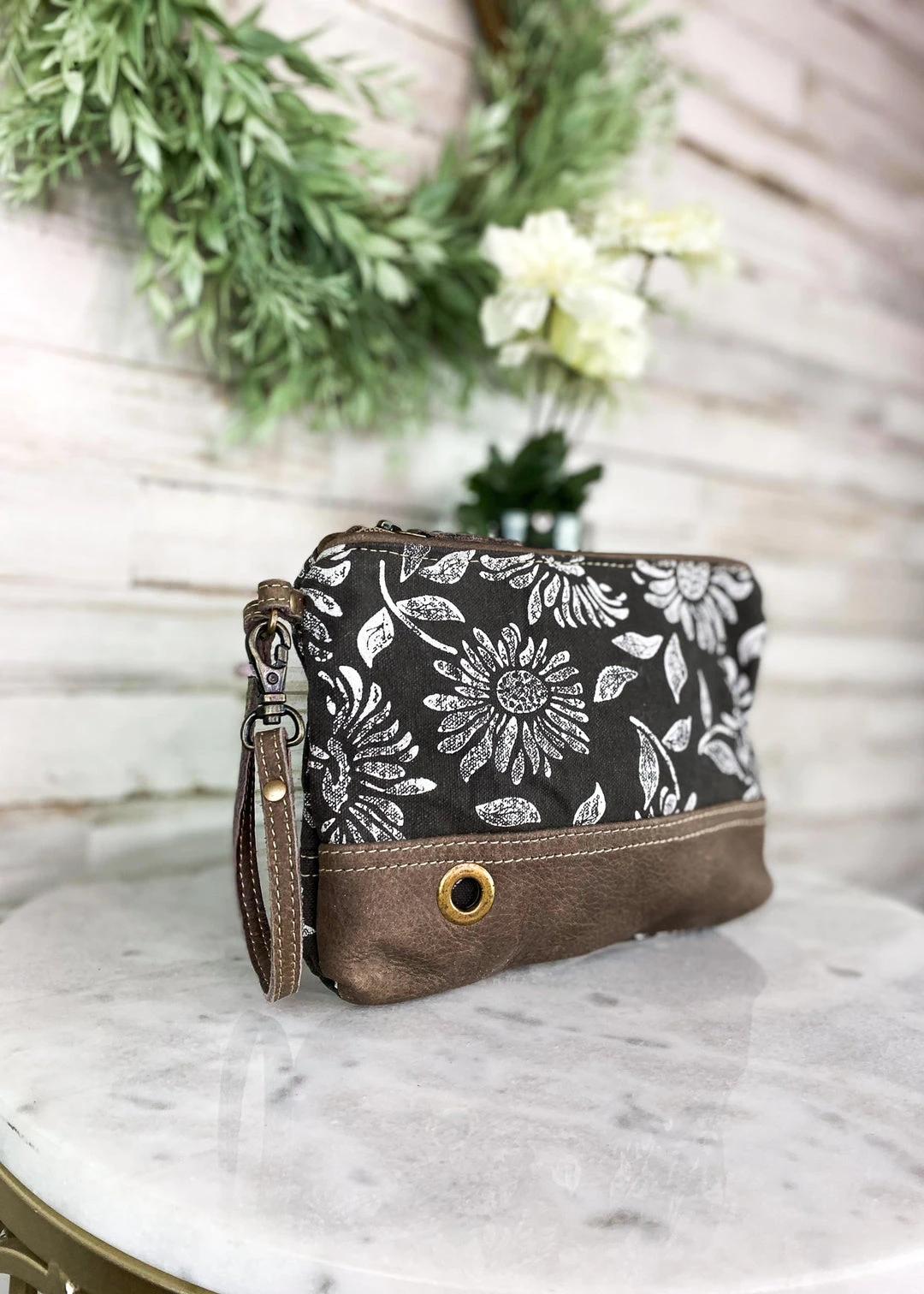 - The Myra Distressed Sunflower Wristlet/Pouch is a versatile and stylish accessory designed to keep your essentials organized. Perfect for carrying cosmetics, cards, keys, and small items, this wristlet combines fashion and functionality.