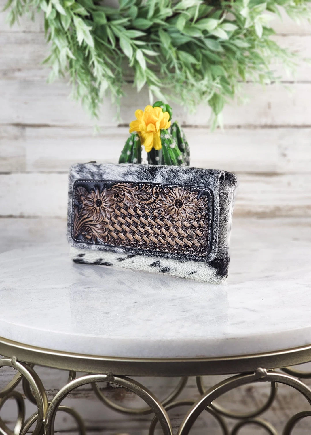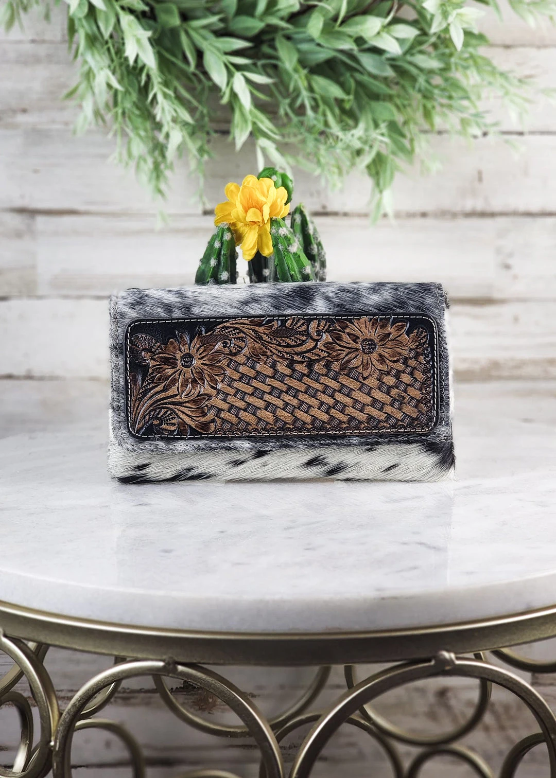 - Crafted with premium cowhide leather, the Myra Eternity Wallet combines durability with timeless elegance. Its tooled design adds a unique, artisanal touch.