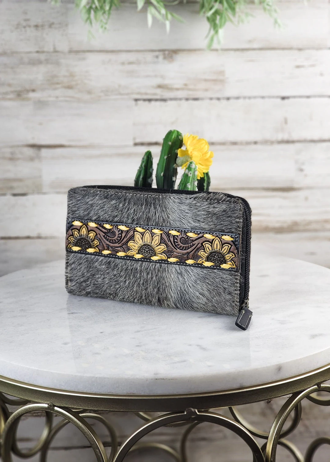 - Perfect for everyday use or as a thoughtful gift, the Myra Grey Cowhide & Sunflower Wallet combines practicality with timeless design. Its premium craftsmanship ensures it will remain a favorite for years to come.