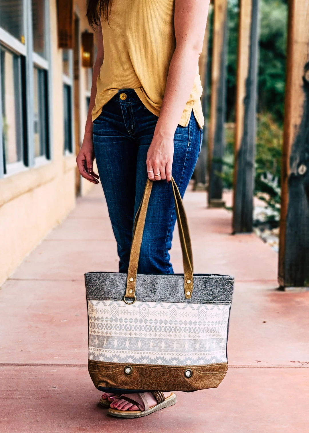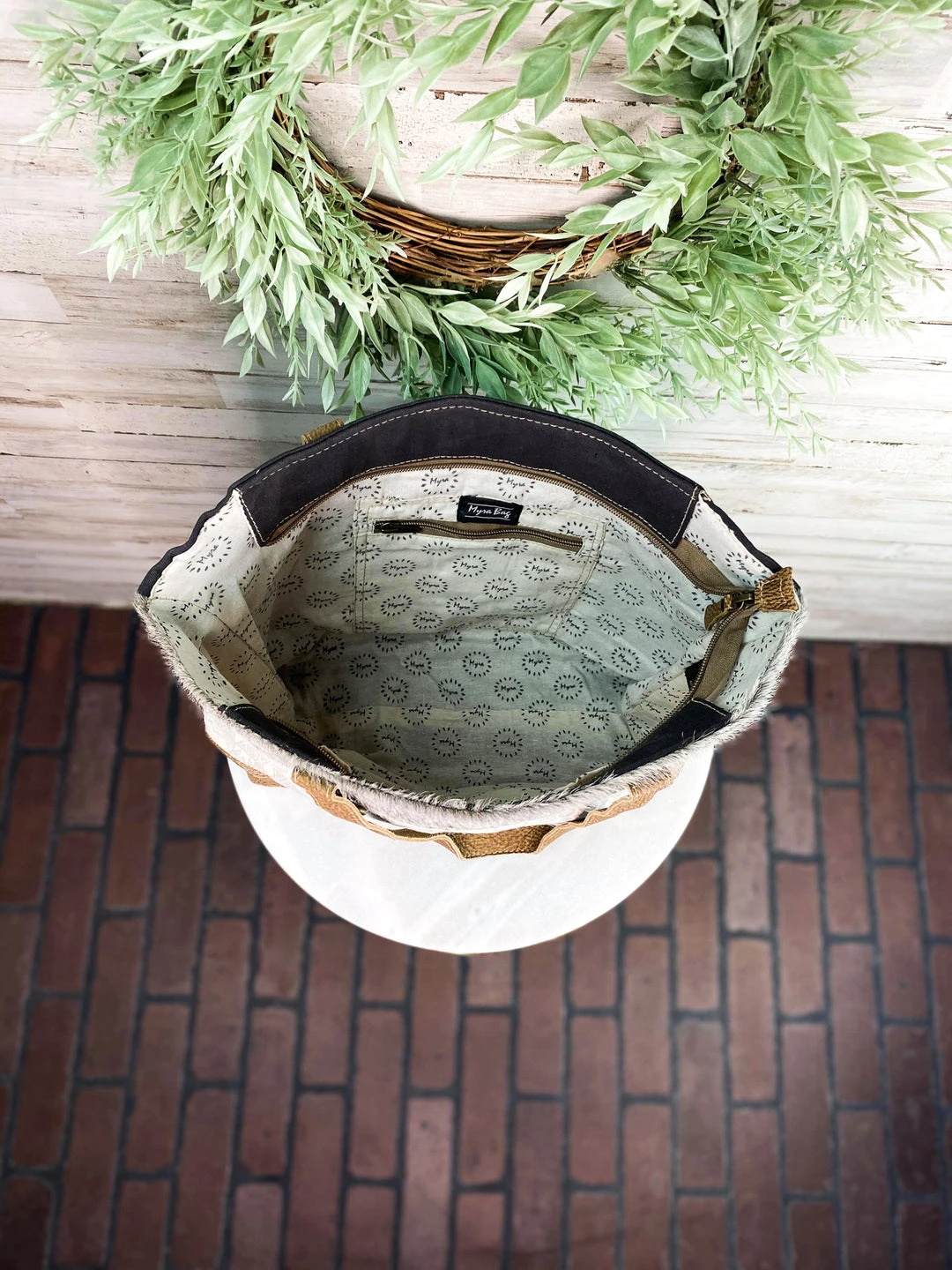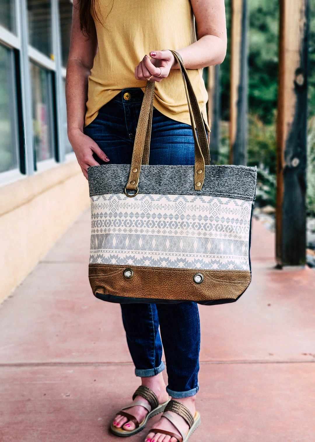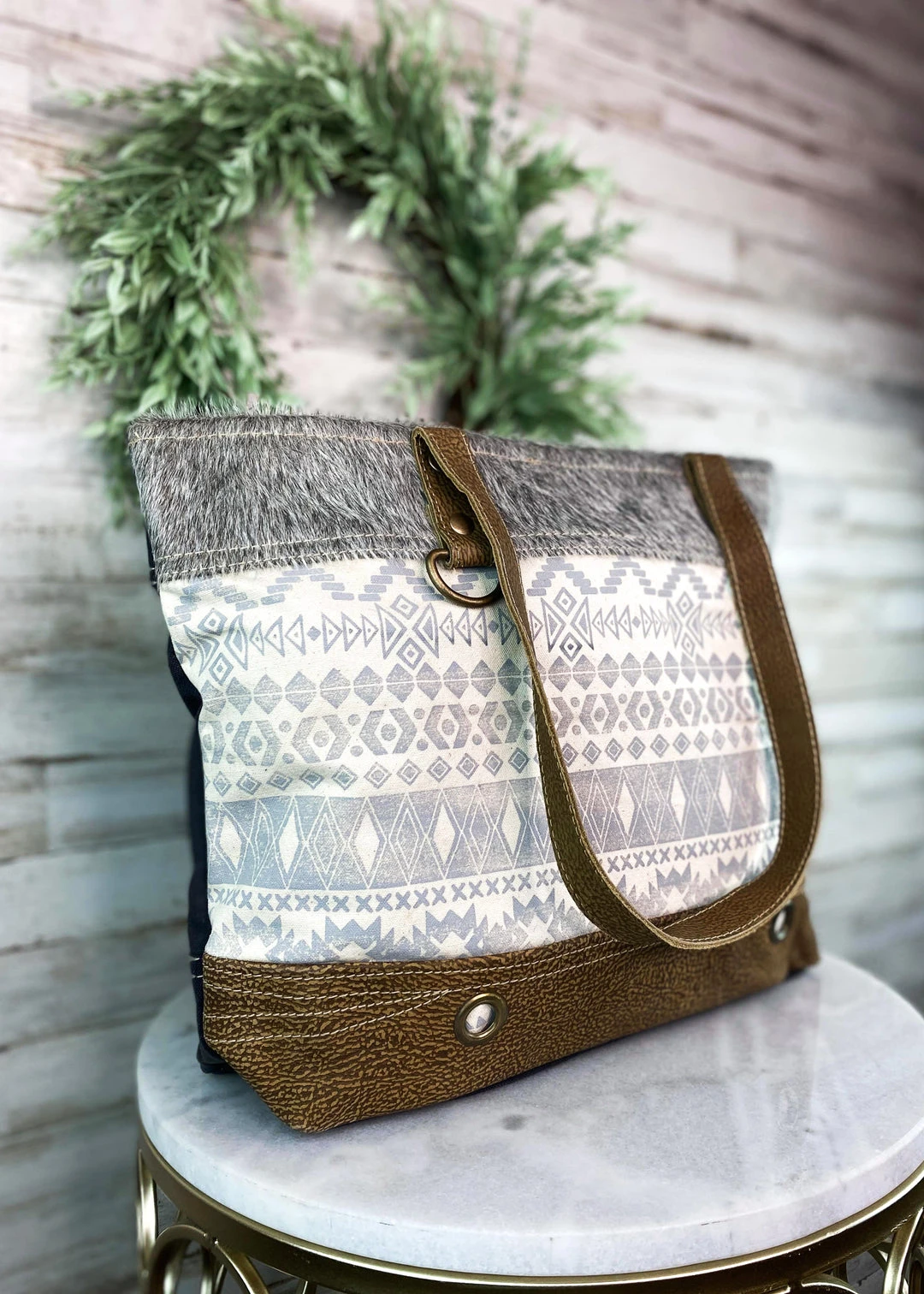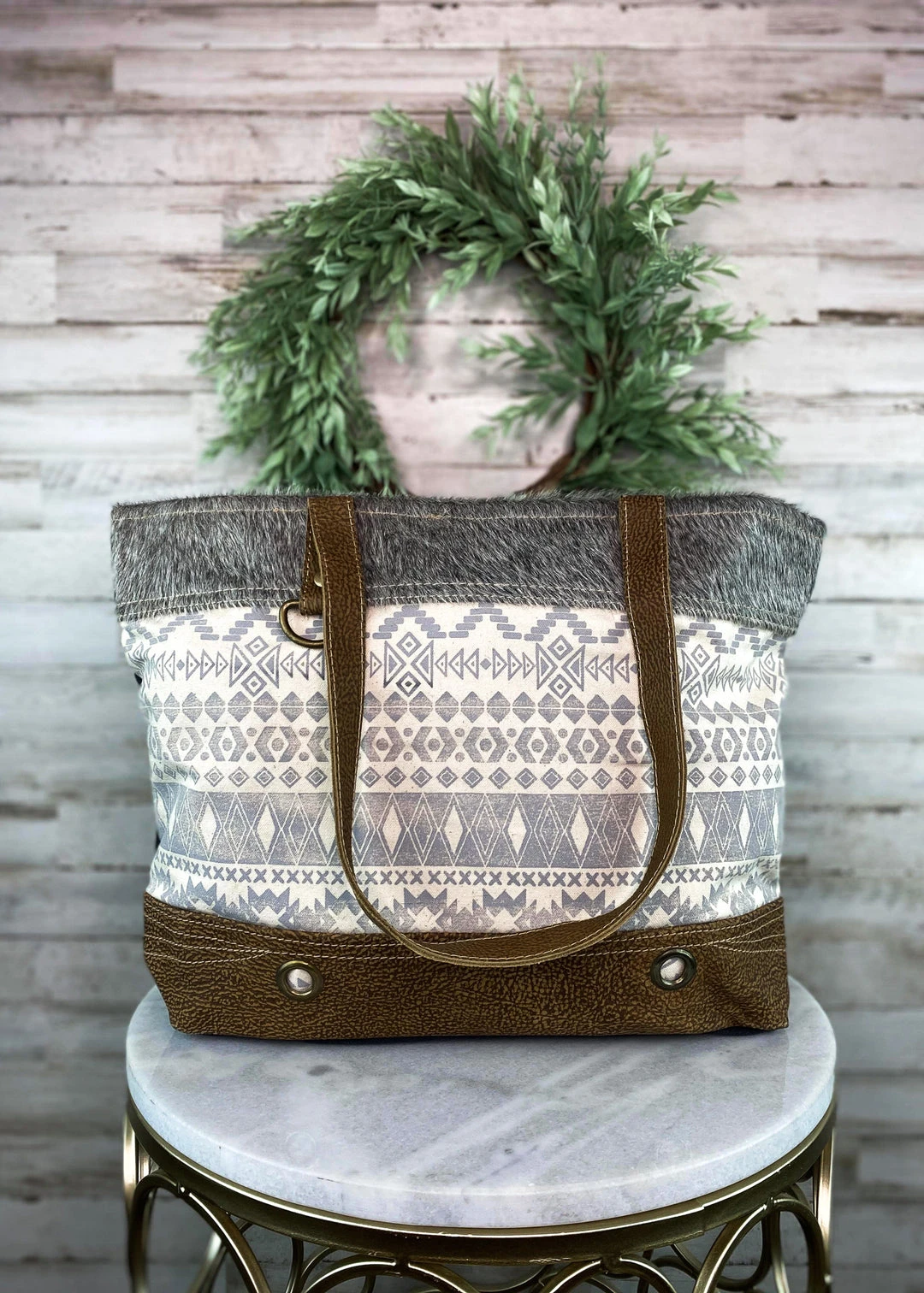 - Elevate your style with the Myra Grey & Cream Aztec Cowhide Tote Handbag. Featuring a unique Aztec design, this handbag combines fashion and functionality.