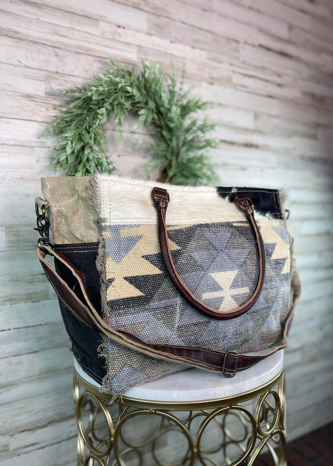 - Elevate your style with the Myra Aztec Cowhide Weekender Bag. Made from premium cowhide leather, this bag features a unique Aztec design that combines elegance with durability.