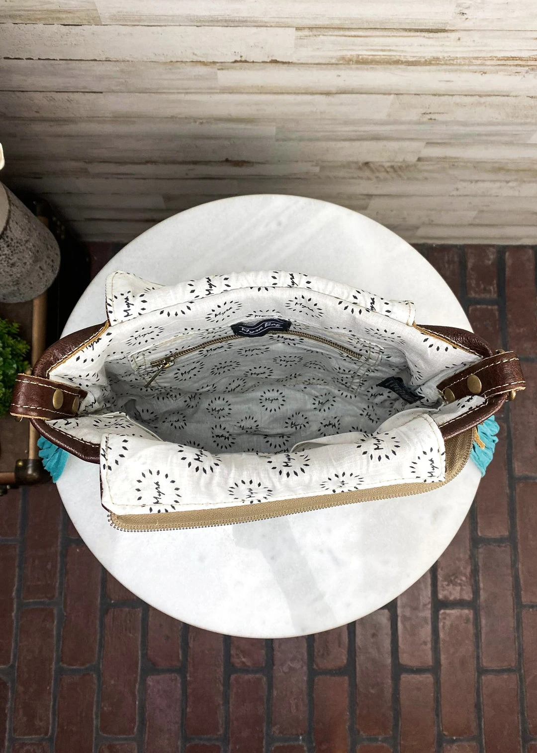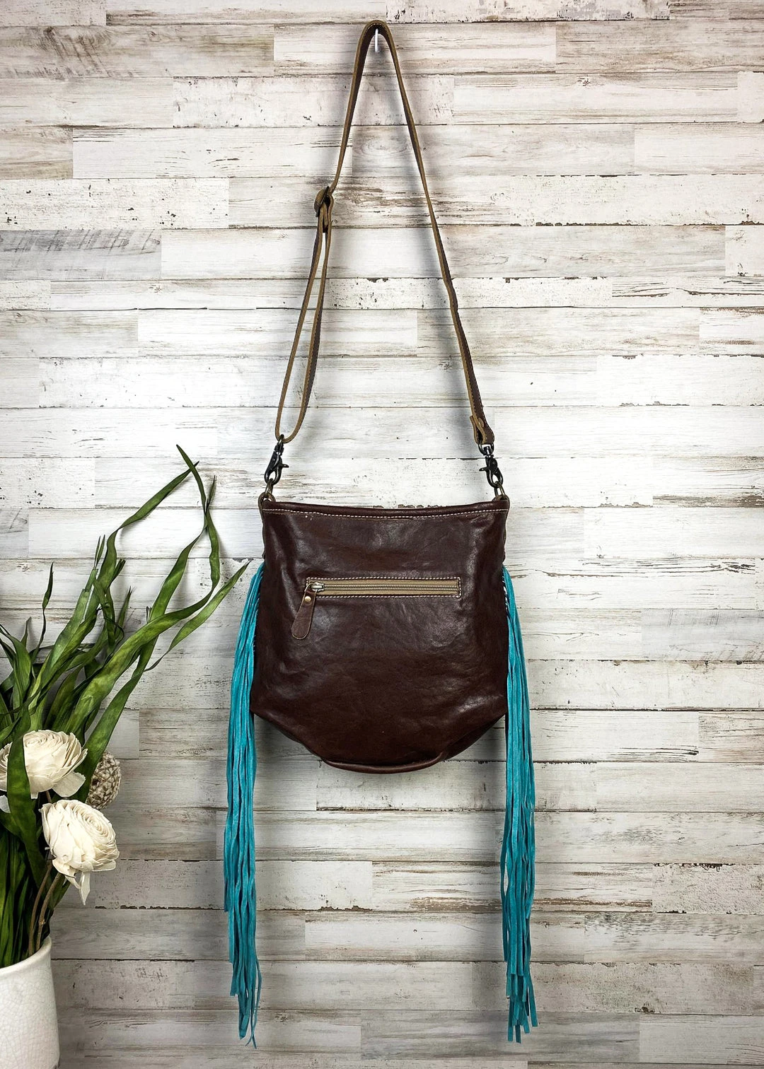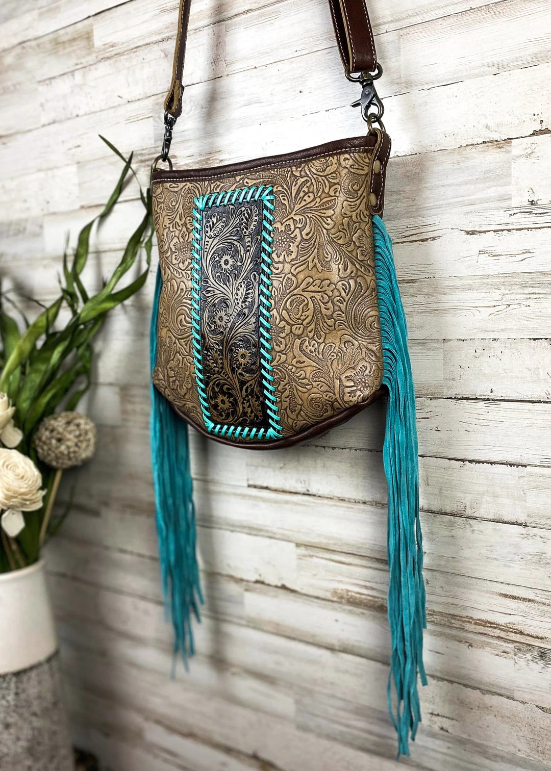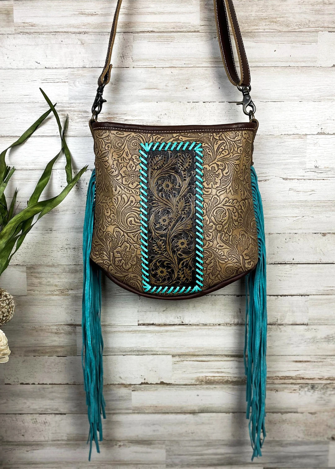 - Enjoy hassle-free shopping with our secure payment options and fast, reliable shipping. Add the Myra Handbags & Wallets Brown Floral Tooled & Turquoise Whipstitched Crossbody Handbag to your collection today!