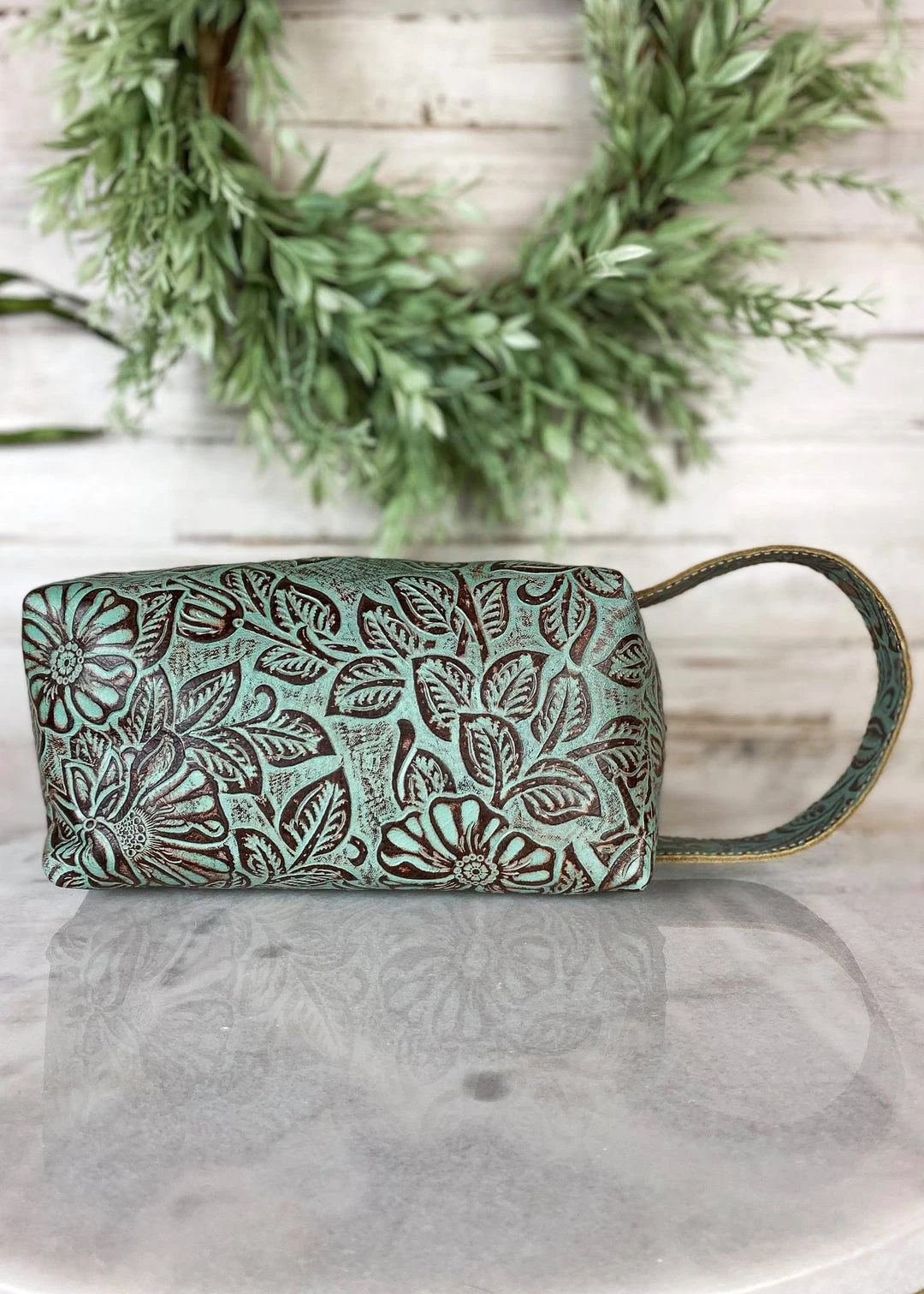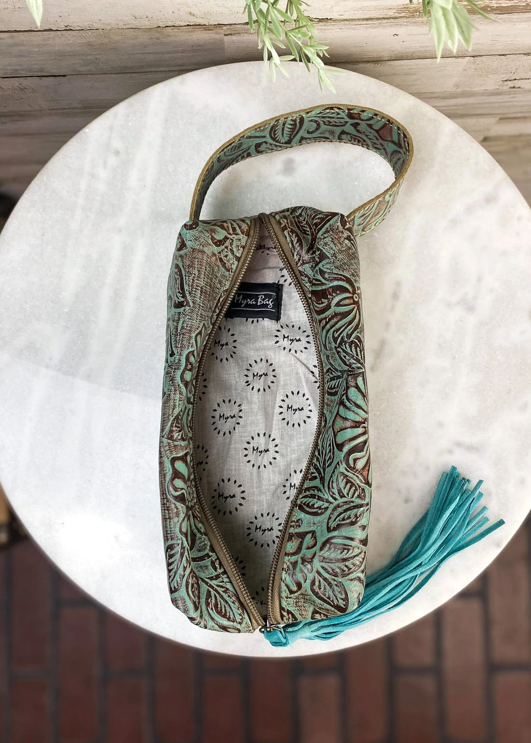 - The Myra Handbags & Wallets Patina Floral Tooled Cosmetic Travel Bag combines elegance with functionality. Its unique floral tooled design makes it a standout accessory for any occasion.