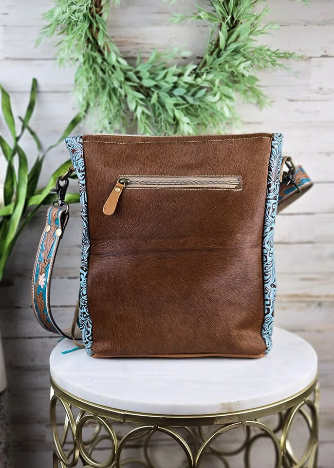 - Elevate your style with the Myra Indigo Aztec Cowhide Fringe Crossbody Handbag. Crafted from premium cowhide leather, this handbag features a unique Aztec design and stylish fringe details.