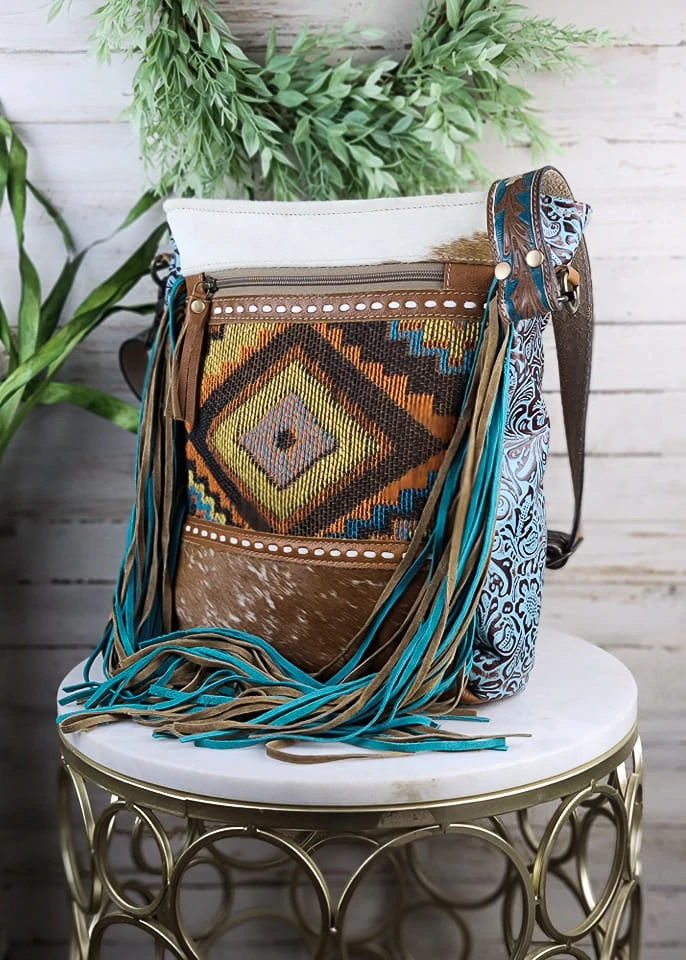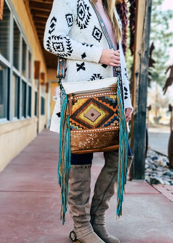 - Add the Myra Indigo Aztec Cowhide Fringe Handbag to your collection today and experience the perfect blend of style, durability, and convenience.