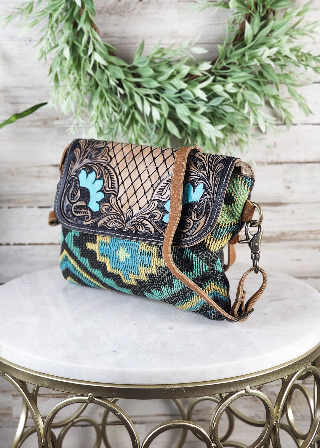 - Elevate your style with the Myra Ivy Teal Aztec Crossbody Handbag. Featuring a vibrant teal Aztec print, this handbag is perfect for adding a pop of color to any outfit.