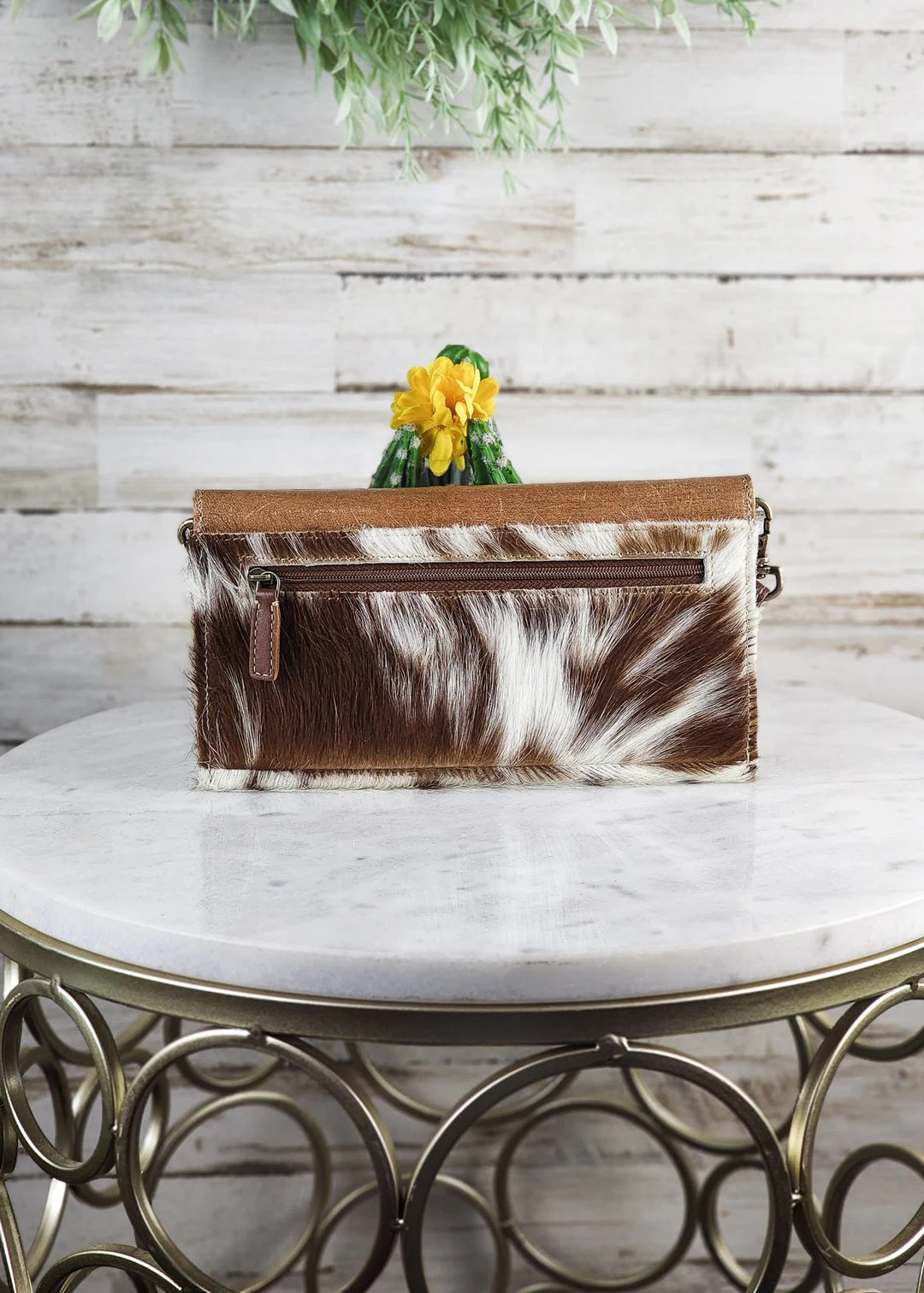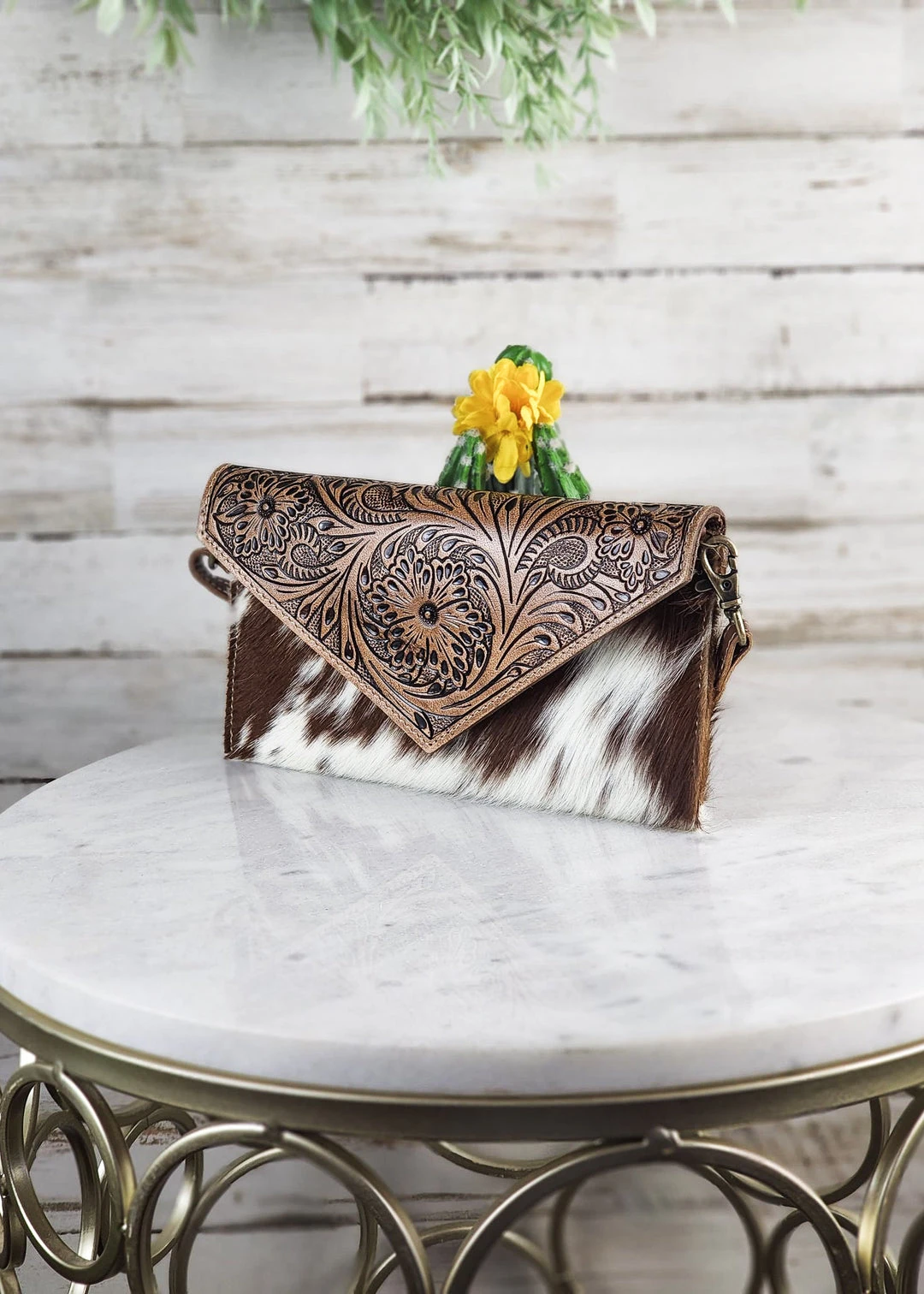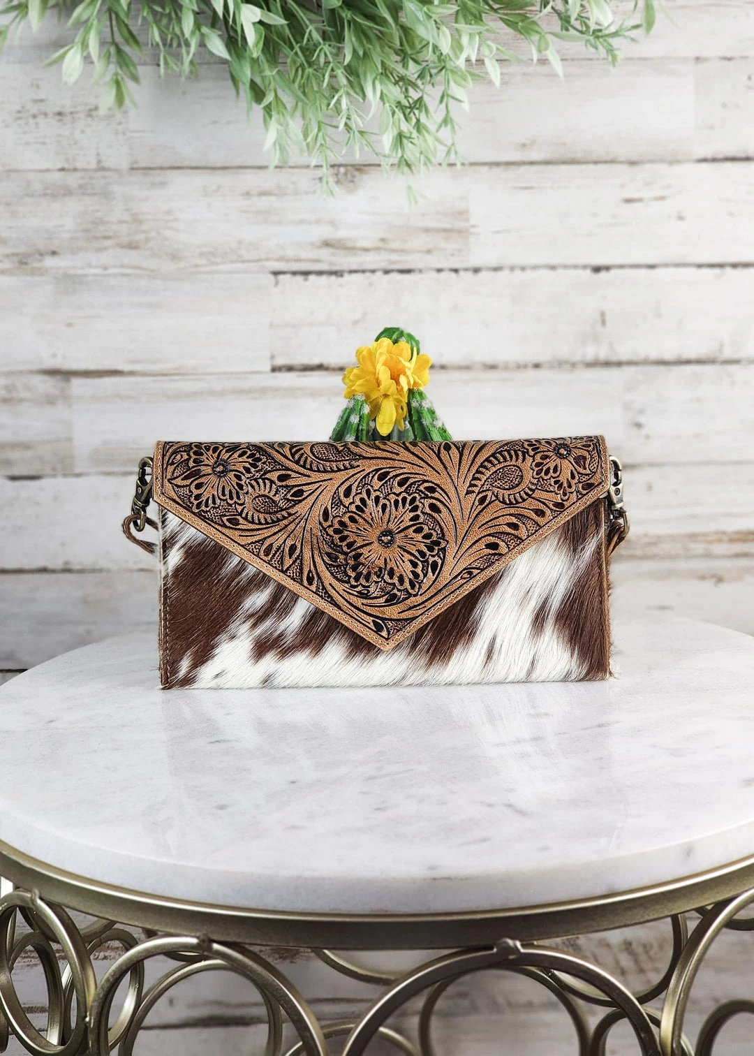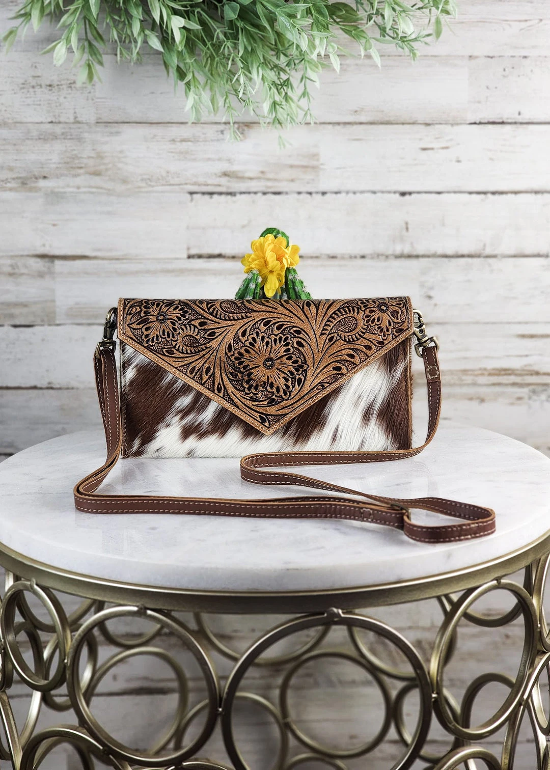 - The Myra Kendra Cowhide Tooled Crossbody Wallet combines style and functionality, crafted from premium cowhide leather for durability and a luxurious feel.