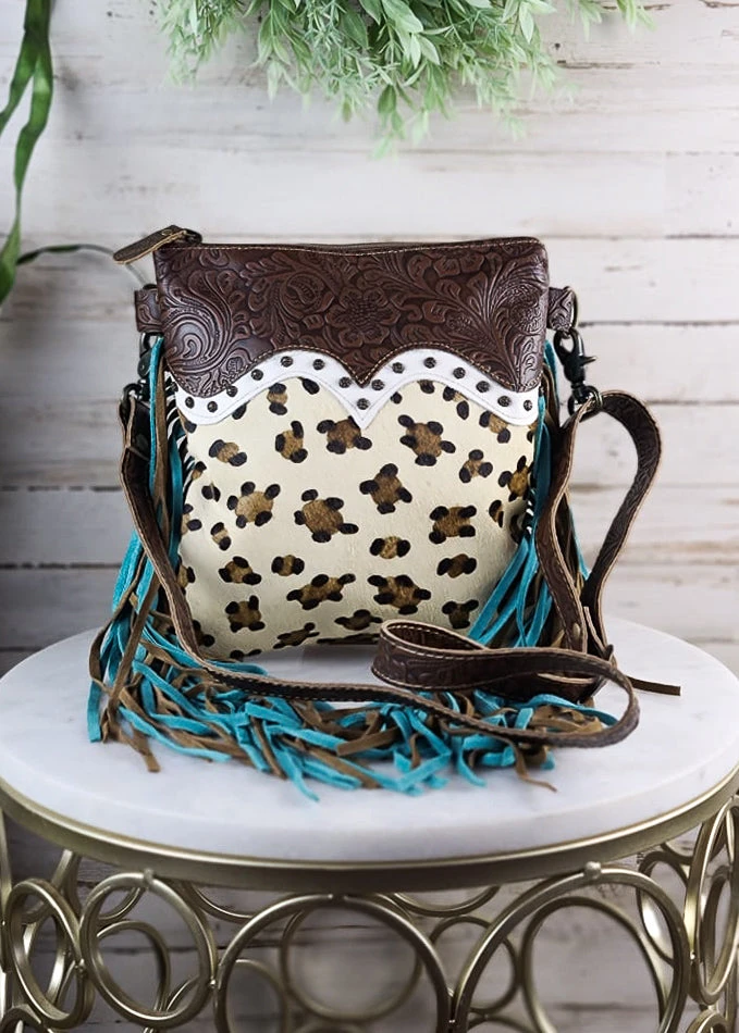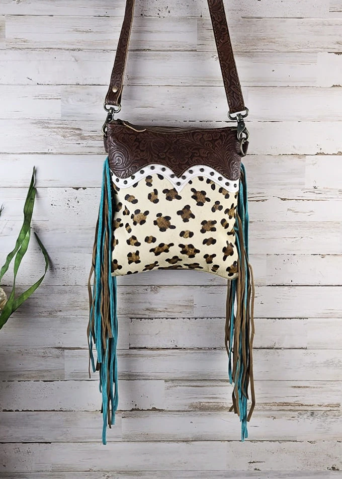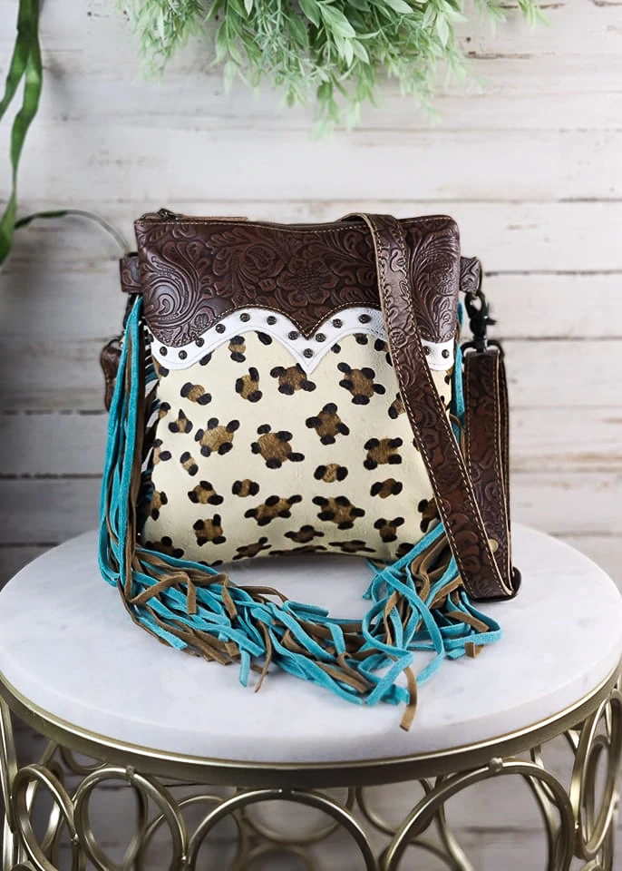 - Crafted from high-quality materials, the Myra Leopard & Fringe Crossbody Handbag is durable and built to last. Its unique design makes it a standout piece in your handbag collection.