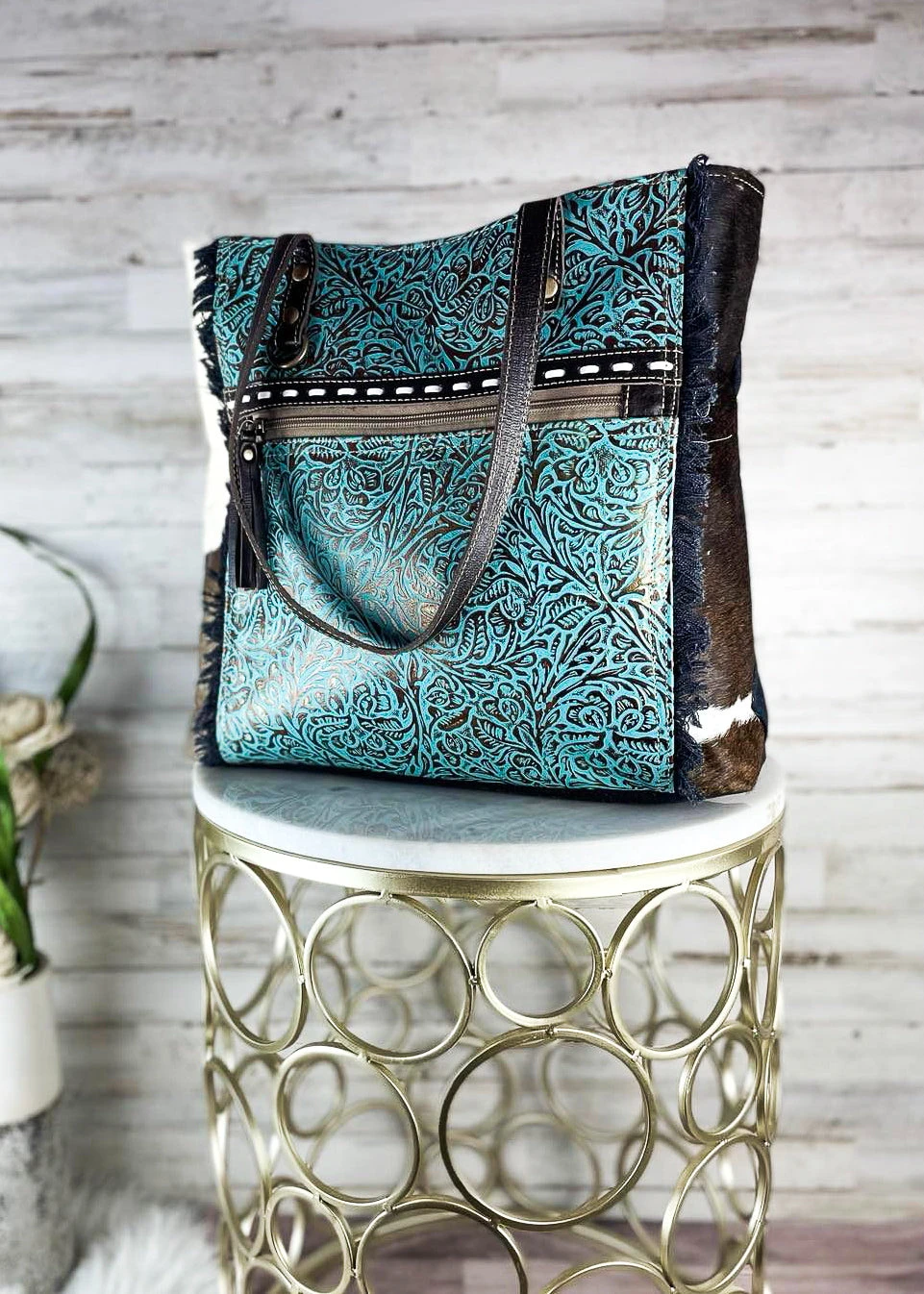 - Elevate your style with the Myra Metallic Patina Cherish Cowhide Tote Handbag. Made from premium cowhide leather, this tote bag combines durability with a luxurious metallic patina finish.