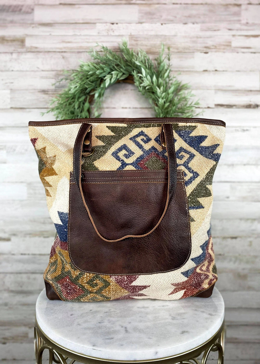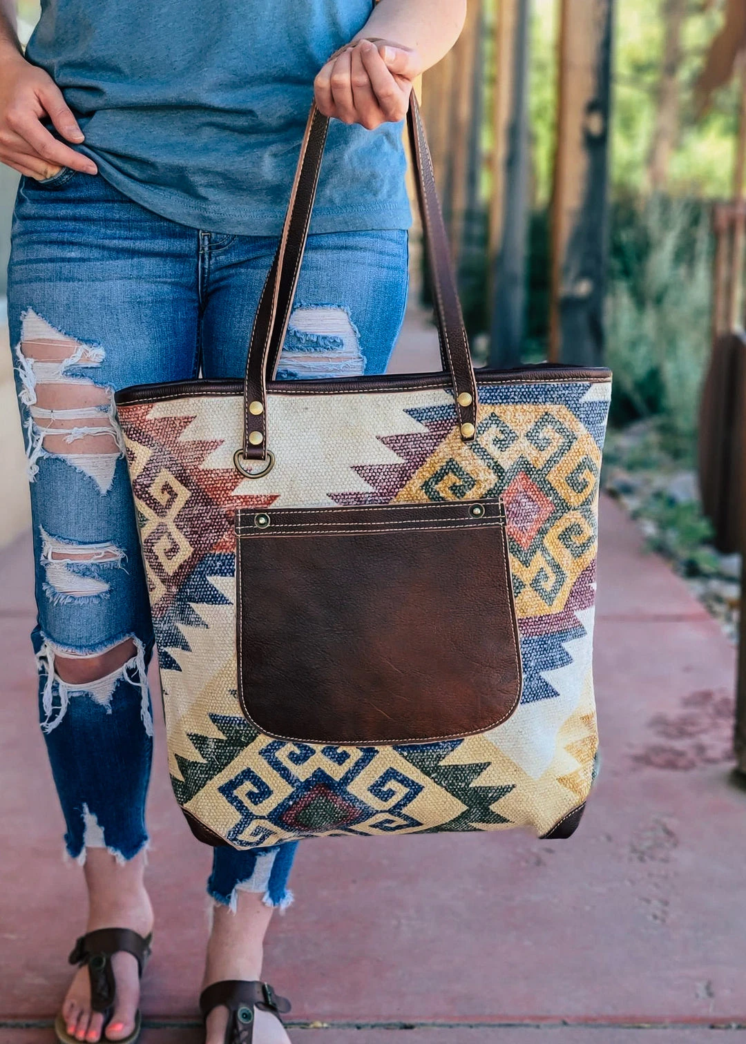 - The Myra Multi Color Aztec Pocket Tote Handbag combines vibrant Aztec patterns with practicality, making it the perfect accessory for any occasion.