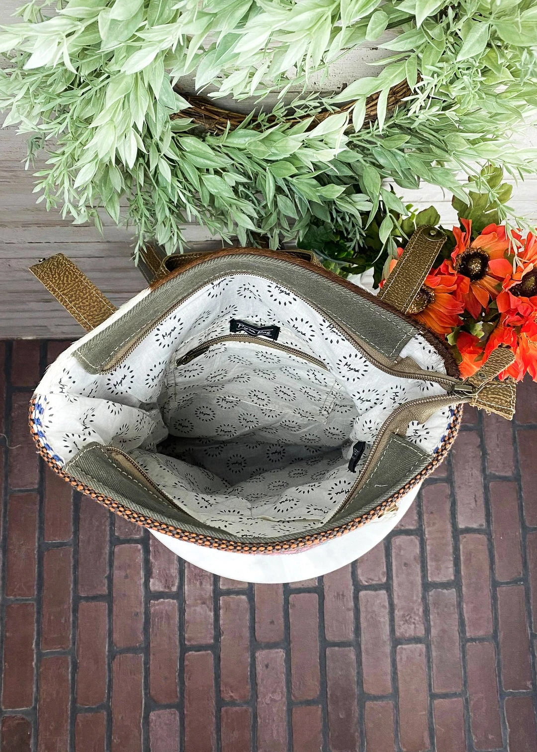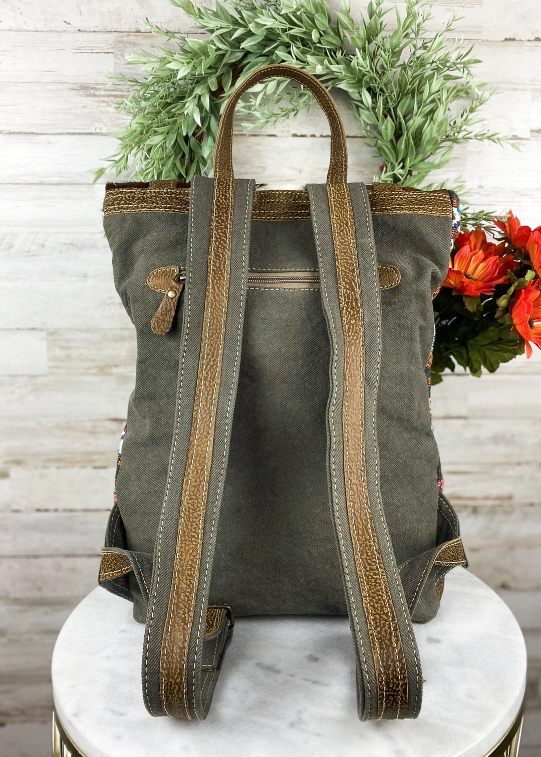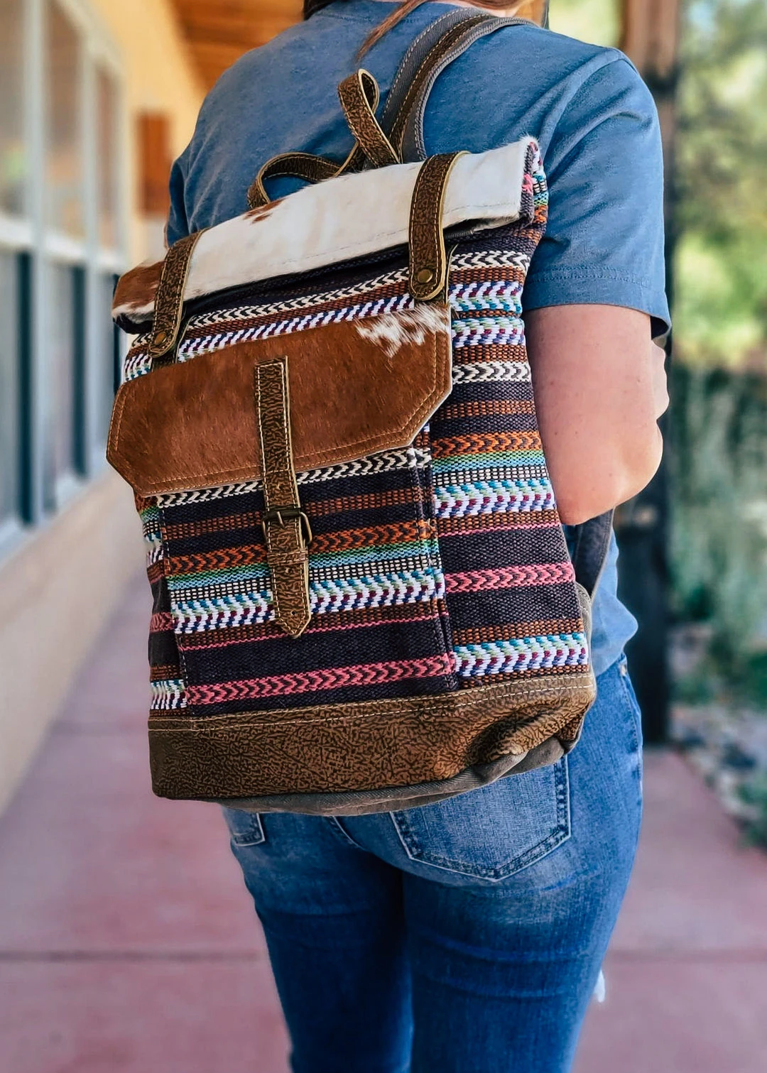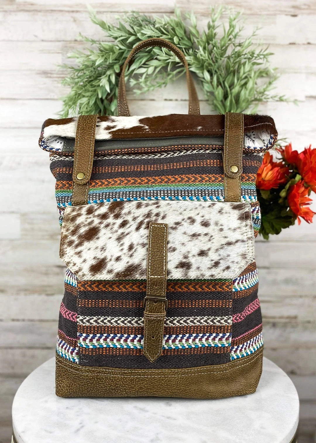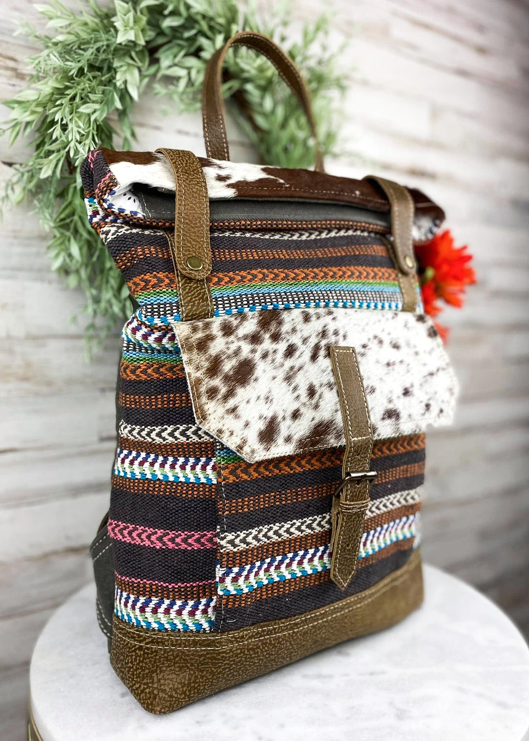 - Elevate your style with the Myra Multi-Color Pattern & Cowhide Backpack, designed for fashion-forward individuals who value both aesthetics and functionality.
