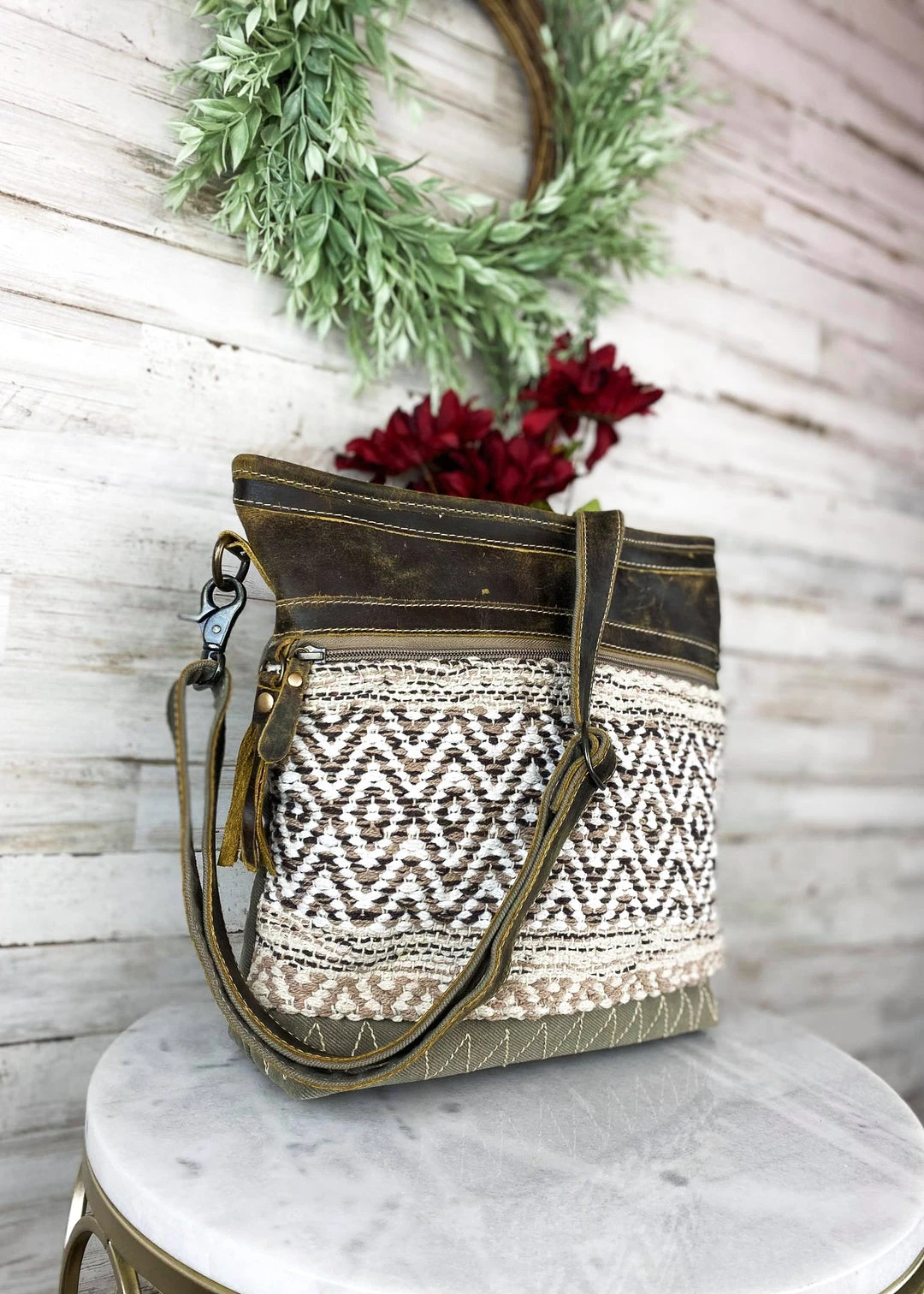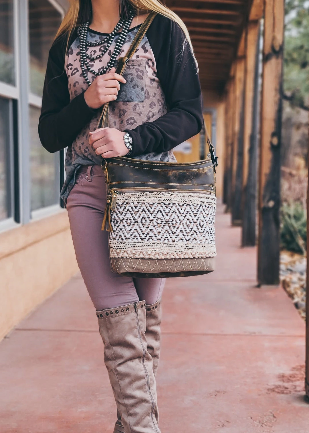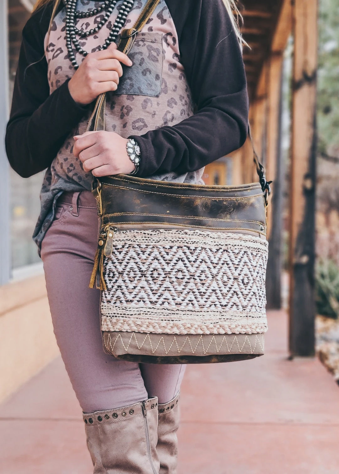 - The Myra Neutral Aztec Crossbody Handbag features a unique Aztec design with a neutral color palette, making it a versatile accessory for any outfit.