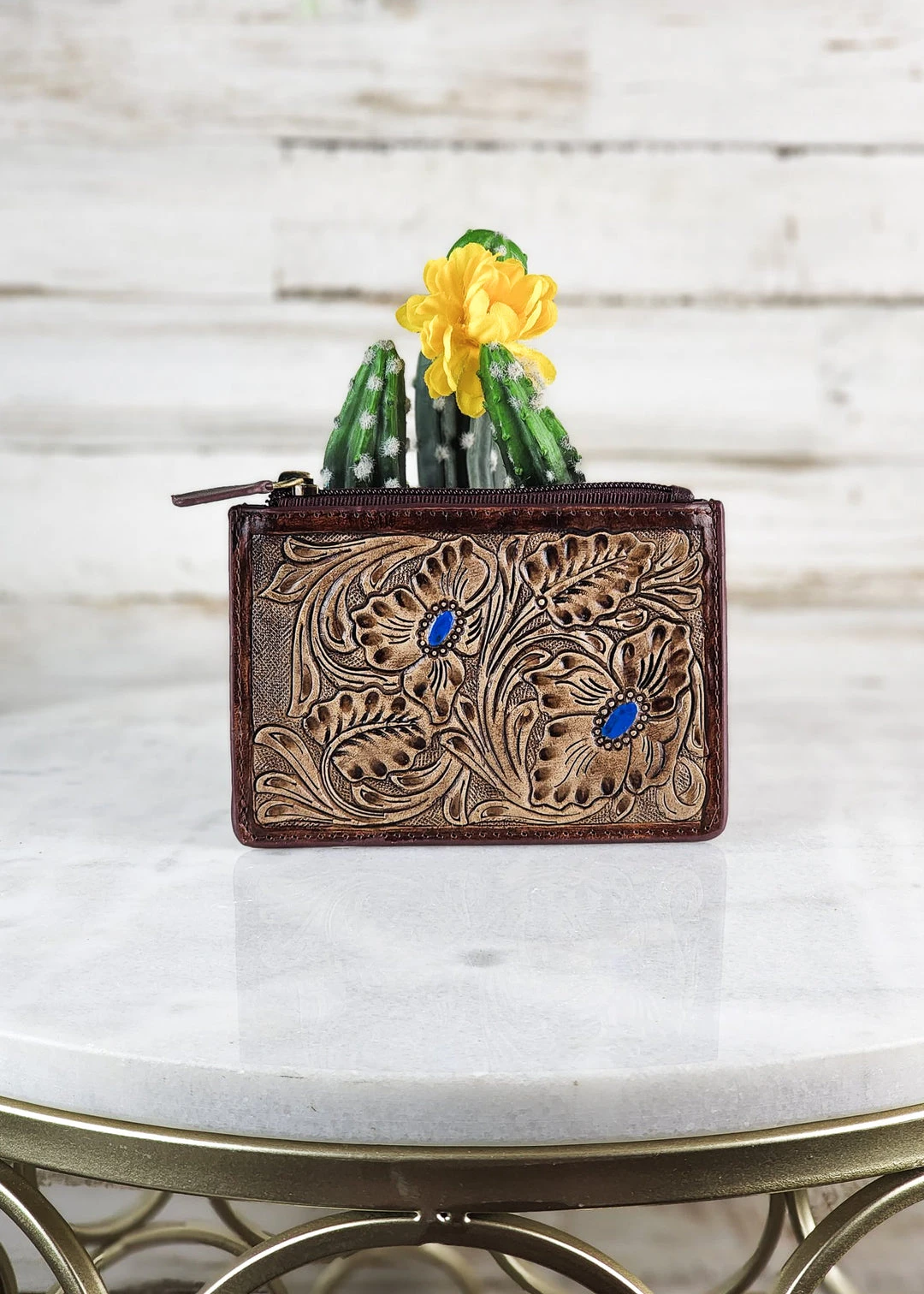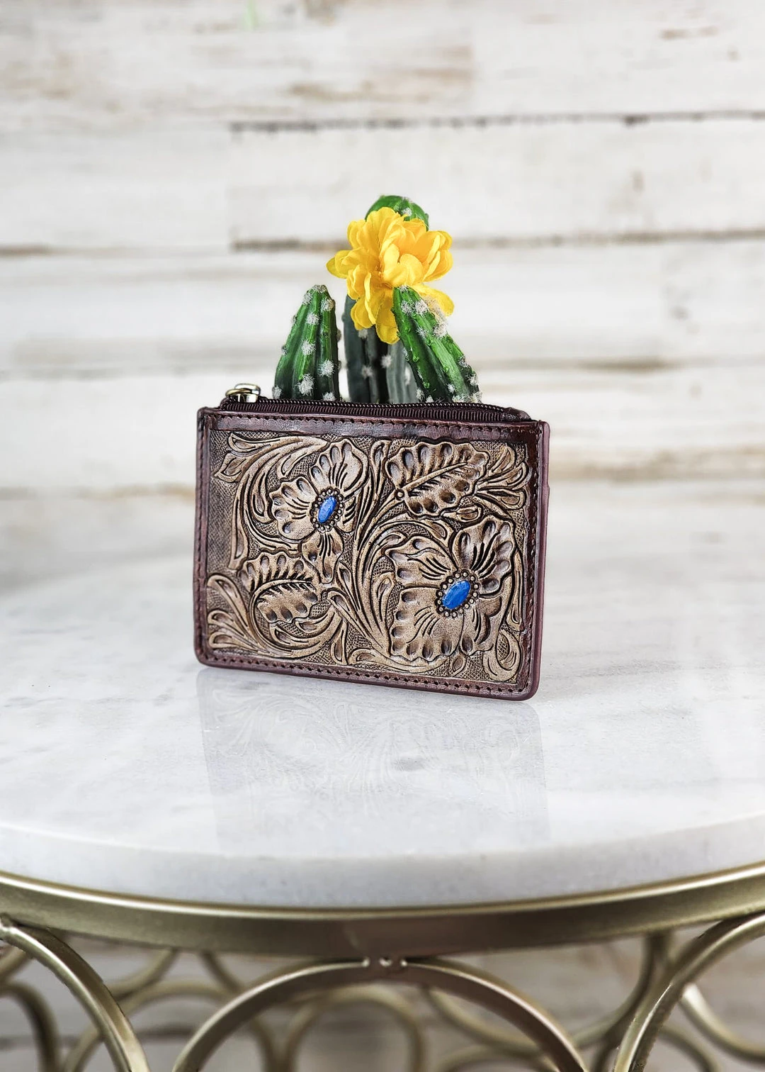 - Elevate your style with the Myra New Arrivals Floral Blue Tooled Card Holder. This compact wallet features a beautiful floral design and a timeless blue hue, making it a perfect accessory for any occasion.