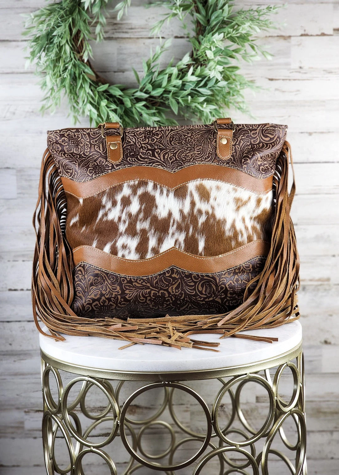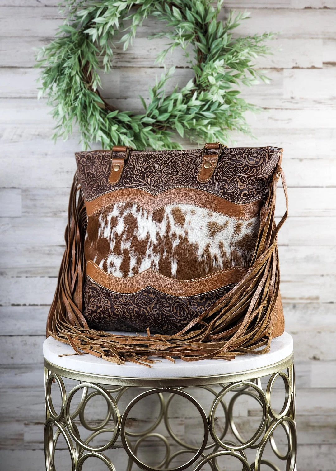 - Elevate your style with the Myra New Arrivals Sioux City Cowhide & Embossed Tote Handbag. Crafted with premium cowhide leather and featuring a unique embossed design, this tote is both durable and fashionable.