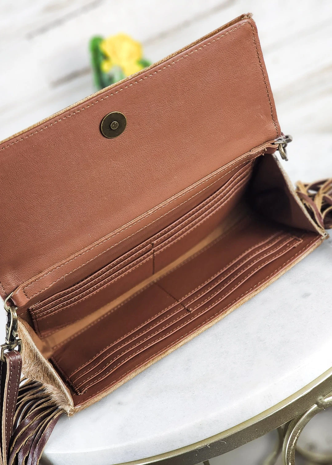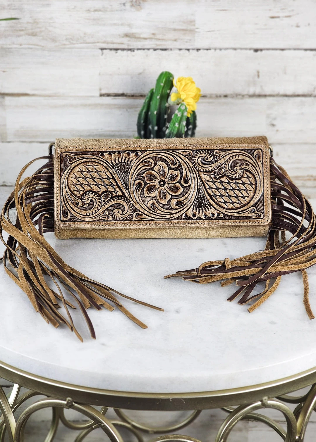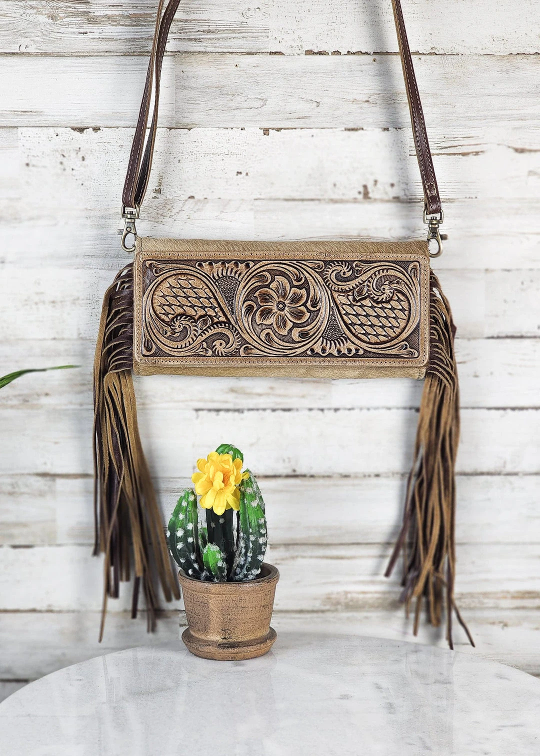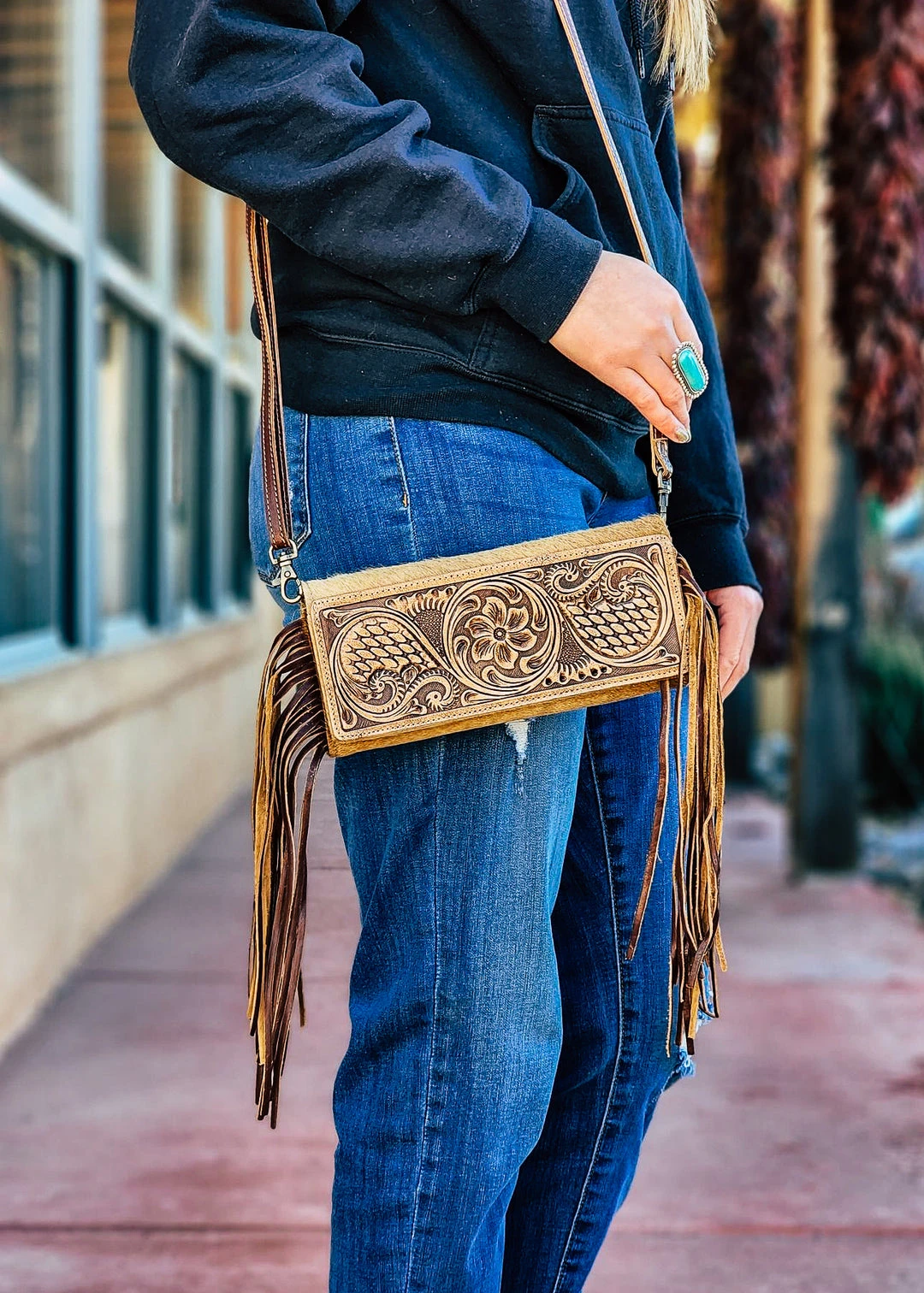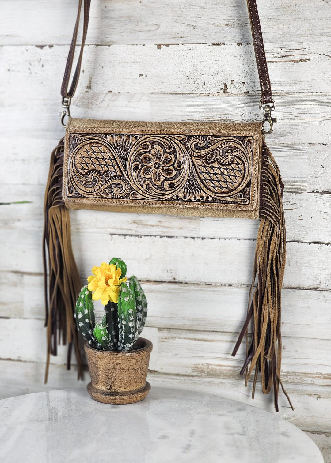 - Crafted from premium cowhide leather, the Myra Nova Wallet Crossbody combines durability with a chic, hand-tooled fringe design. Perfect for adding a bohemian touch to any outfit.