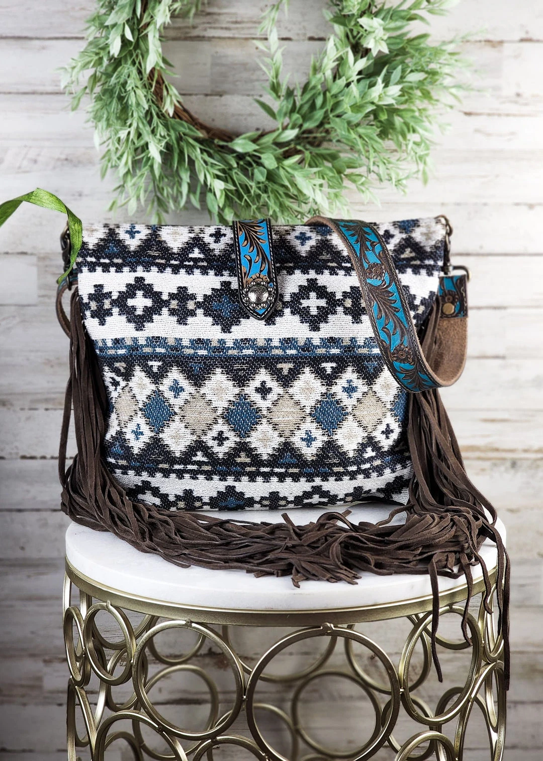 - Enjoy hassle-free shopping with our secure payment options and fast, reliable shipping. Add the Myra Oak Blue Aztec Fringe Crossbody Handbag to your collection today and experience the perfect blend of fashion and functionality.