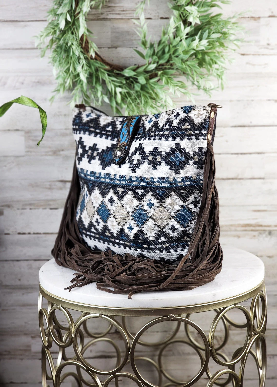 - Elevate your style with the Myra Oak Blue Aztec Fringe Crossbody Handbag. Featuring a unique Aztec design and fringe detailing, this handbag is perfect for adding a boho-chic touch to any outfit.