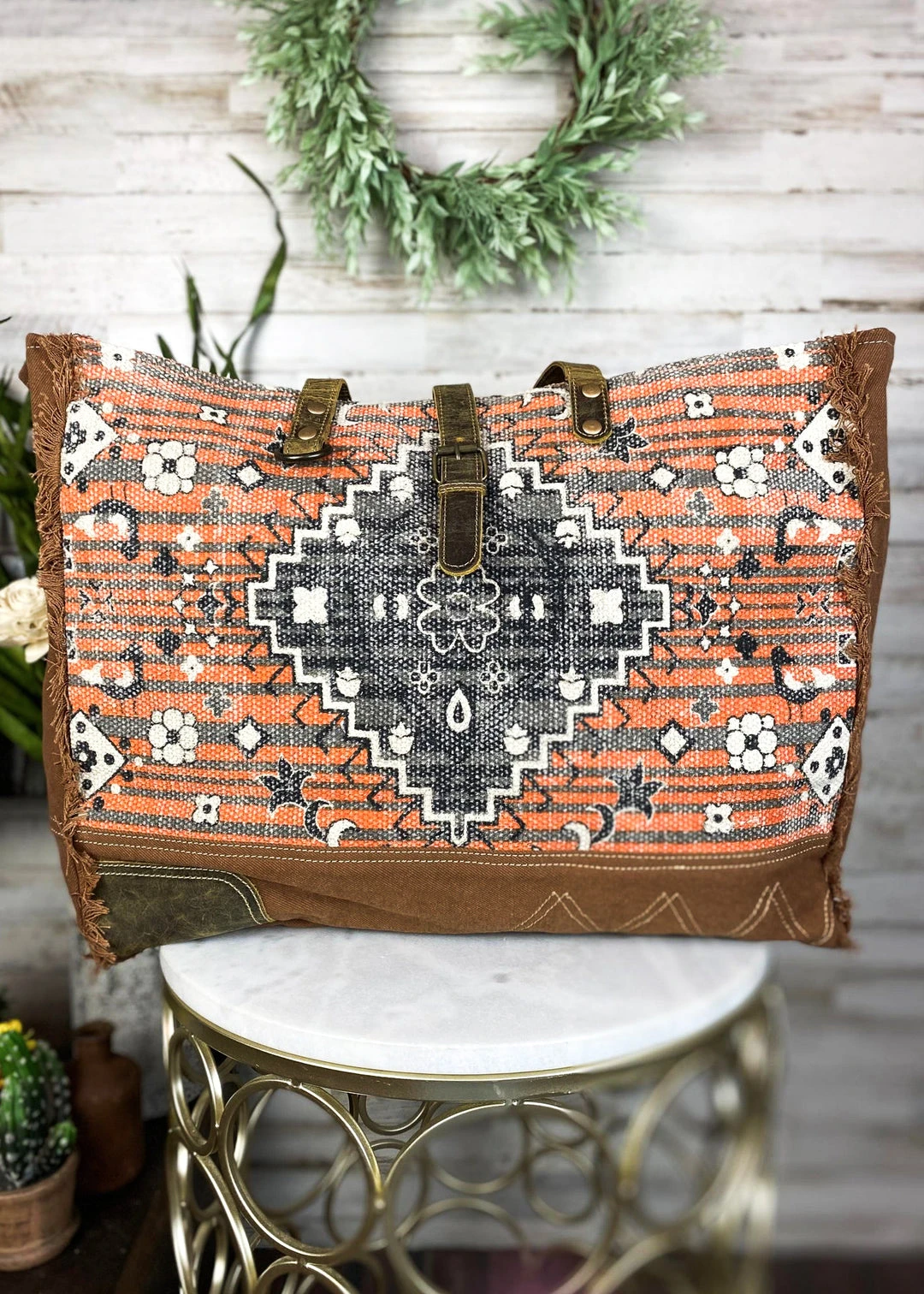 - The Myra Orange Rust Vintage Floral Weekender Handbag is the perfect blend of style and practicality. Its vintage floral print adds a touch of elegance, making it a standout accessory for any occasion.