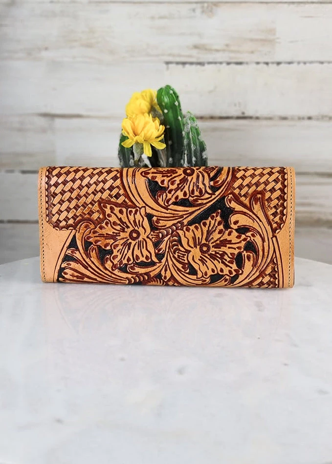 - The Myra Serenity Tooled Wallet is crafted from high-quality leather, offering durability and a timeless design suitable for both men and women.