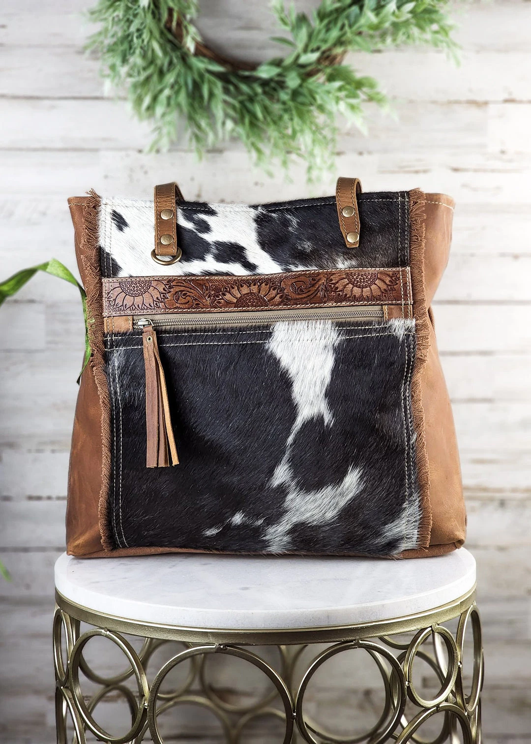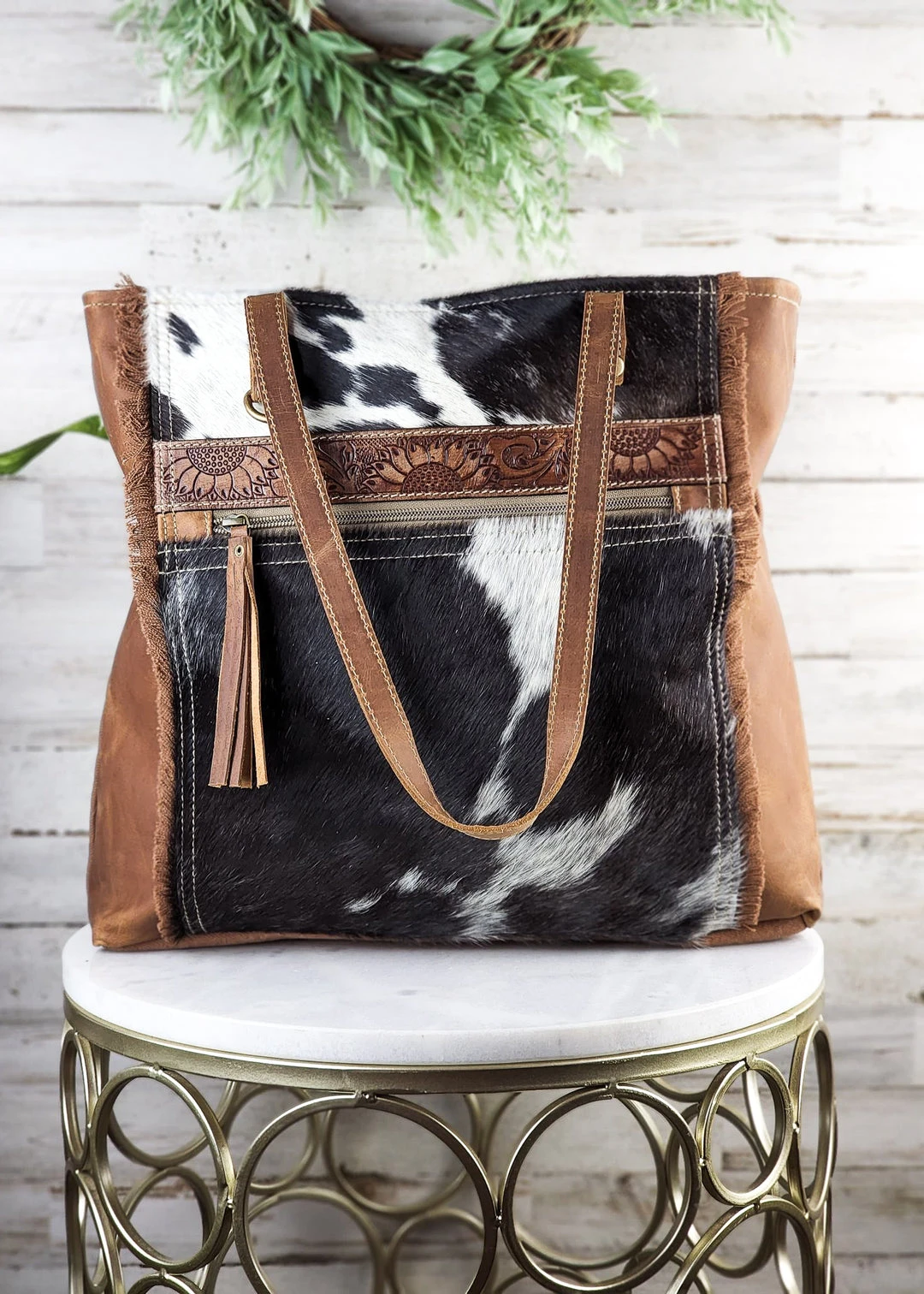 - Elevate your style with the Myra Soakin’ Up Sunflowers Tote Bag, crafted from premium cowhide for unmatched durability and a luxurious feel.