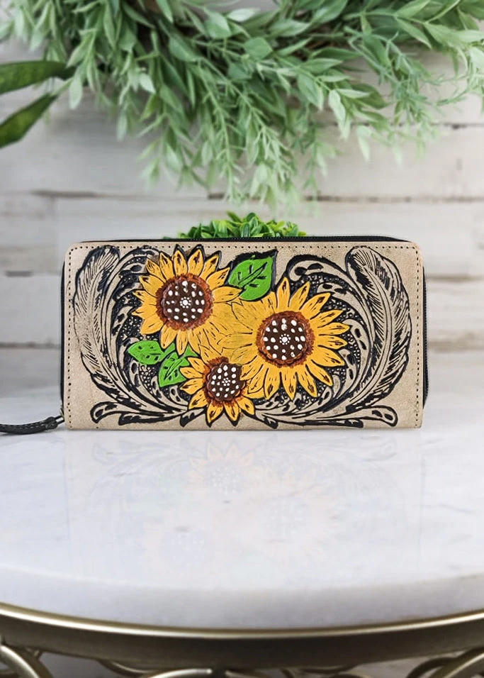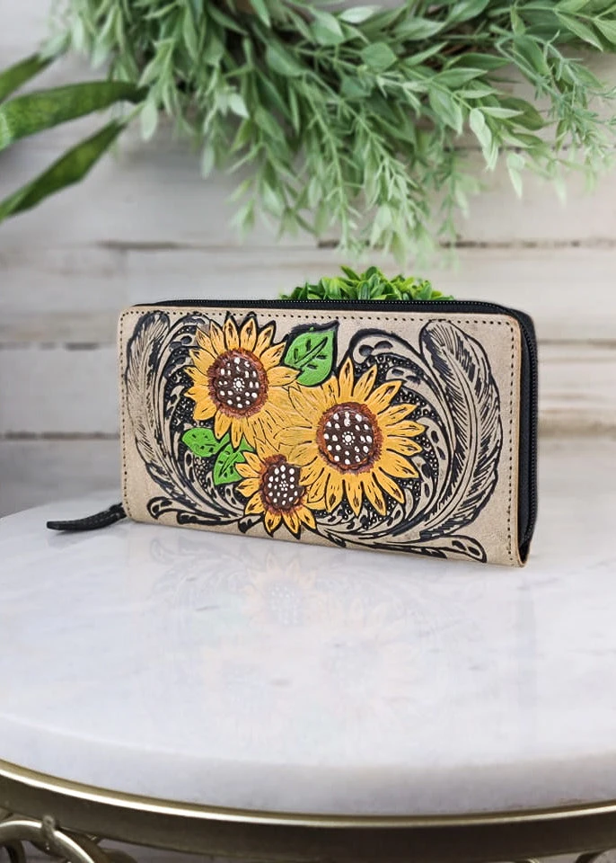 - Perfect for gifting or personal use, the Myra Sunflower & Feathers Tooled Wallet is available now. Add a touch of sophistication to your everyday carry with this exquisite leather cardholder.