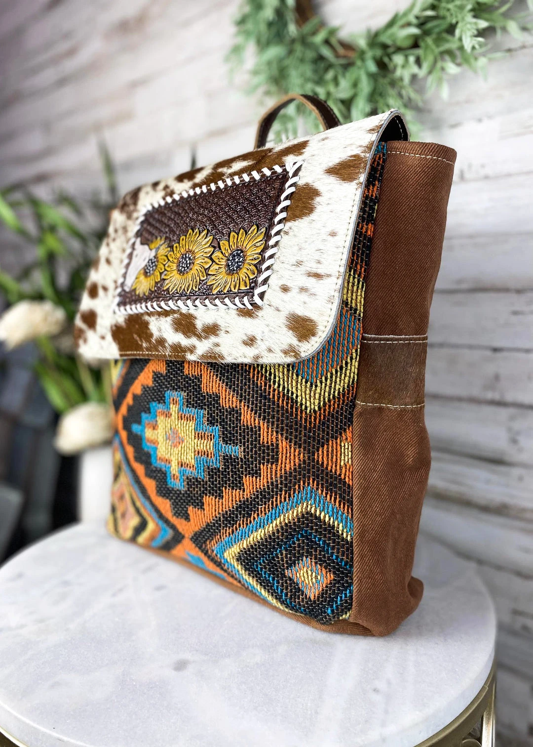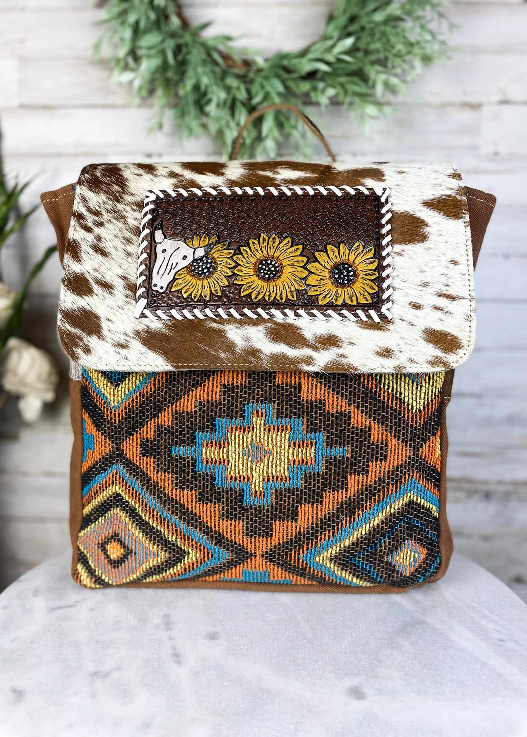 - Unique Design: The Myra Sunflower & Steer Skull Cowhide Backpack features a one-of-a-kind design with a sunflower and steer skull motif, making it a standout accessory.