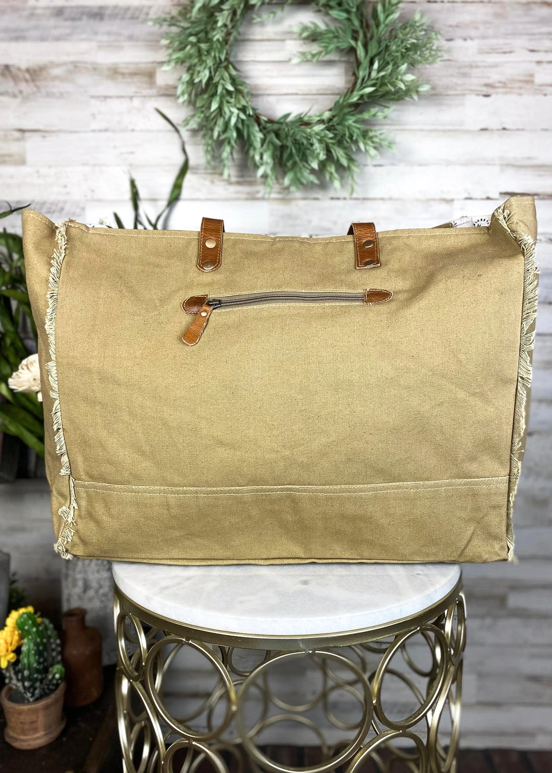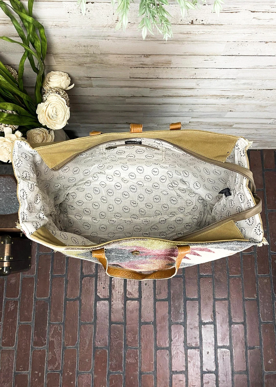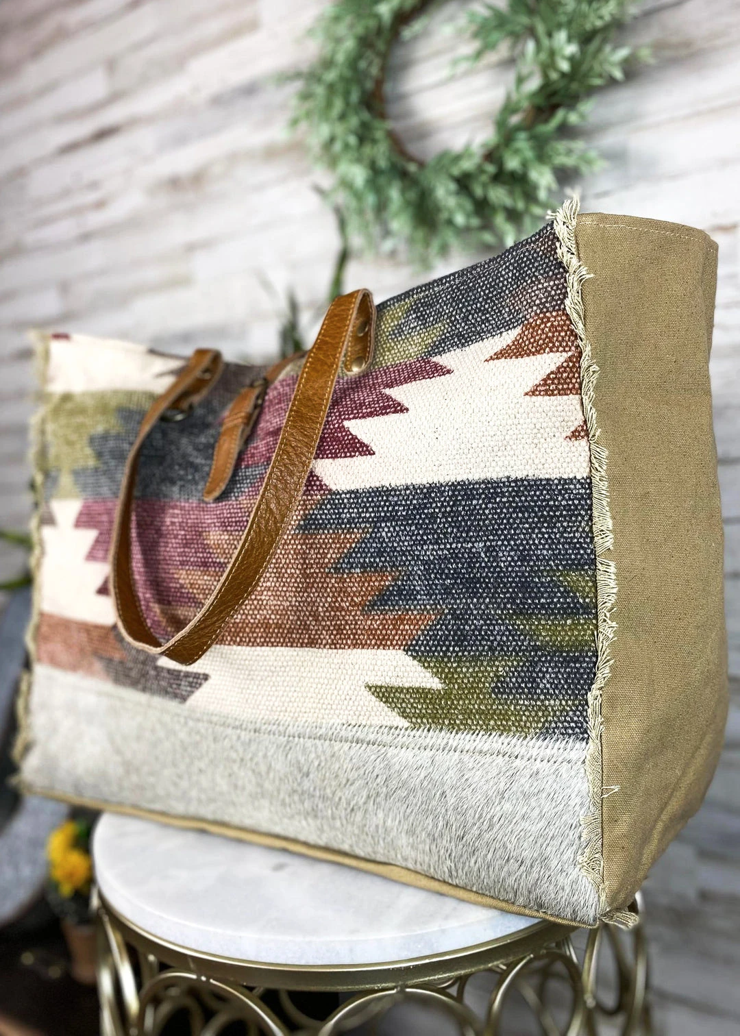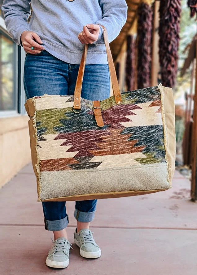 - Elevate your travel style with the Myra Tan Aztec & Cowhide Weekender Handbag, a perfect blend of functionality and fashion. Order now and experience premium quality.