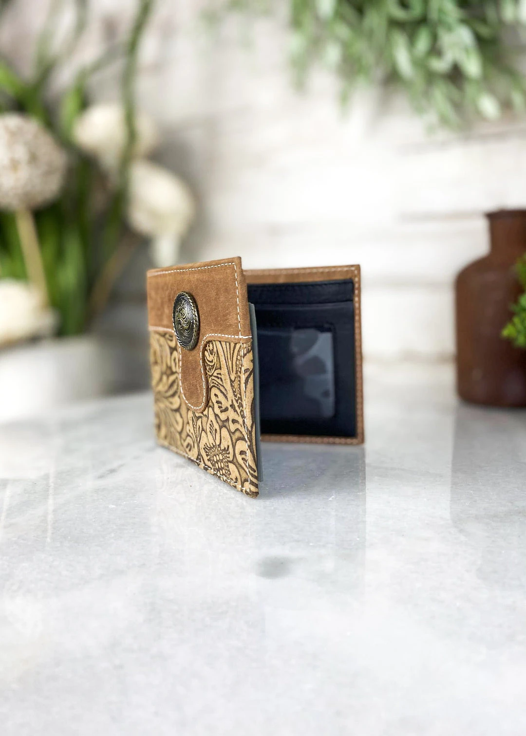 - Elevate your style with the Myra Tan Floral Embossed Bi-Fold Wallet, featuring a stunning floral embossed design and a sleek tan finish.