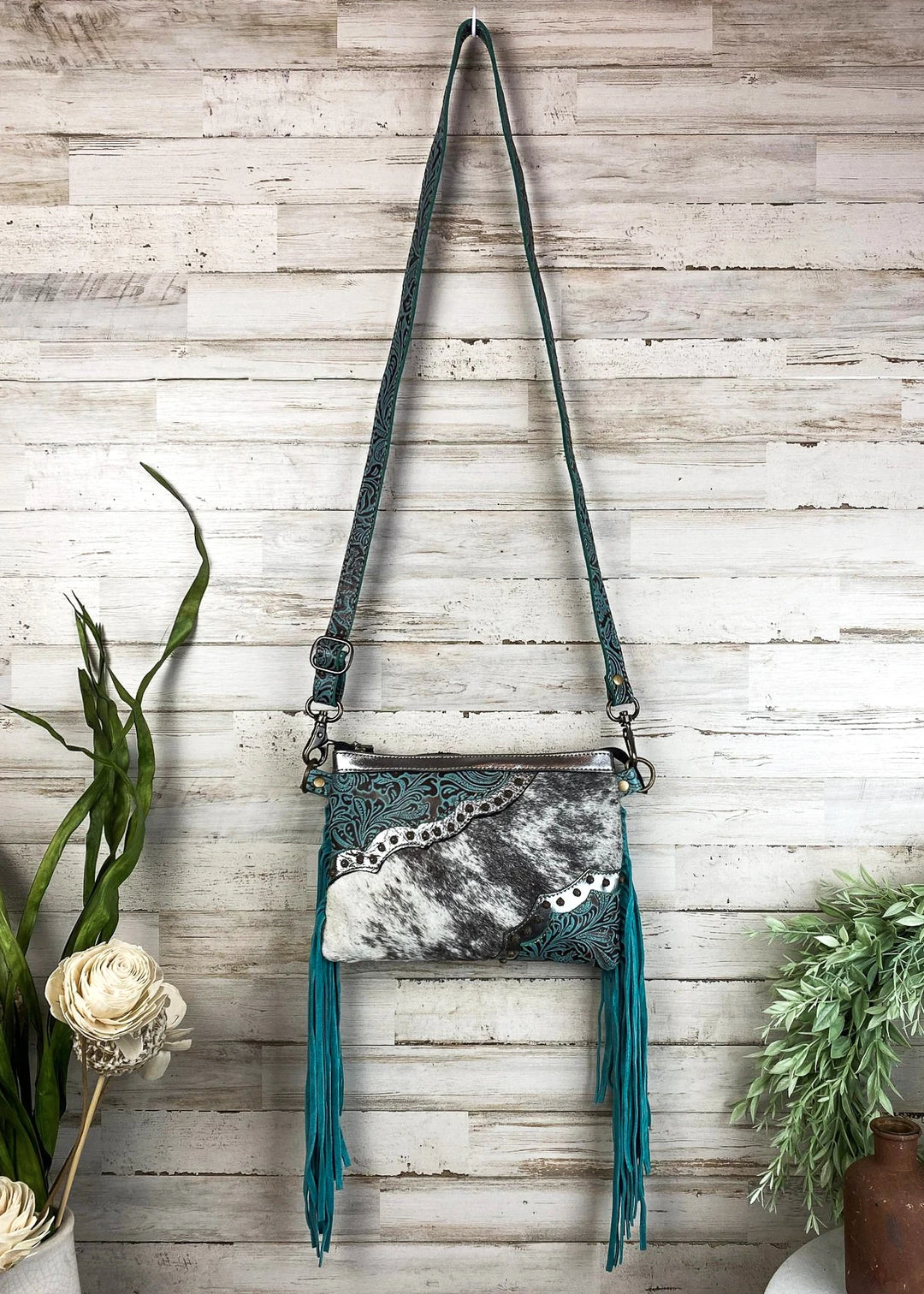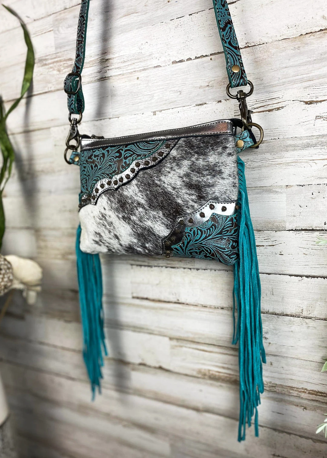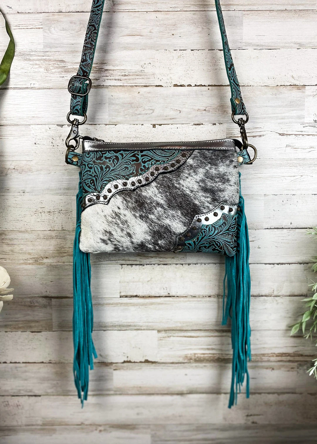 - Make a statement with the Myra Teal & Metallic Silver Fringe Crossbody Bag. Perfect for gifting or adding to your own collection, this bag combines style and practicality effortlessly.