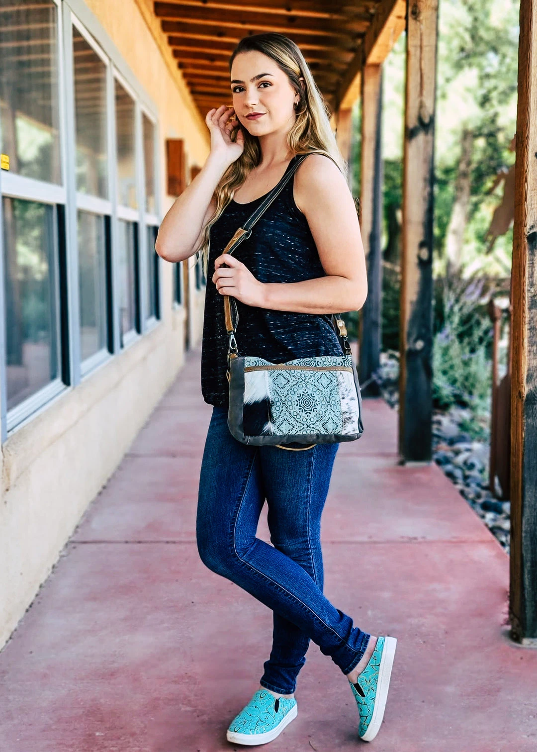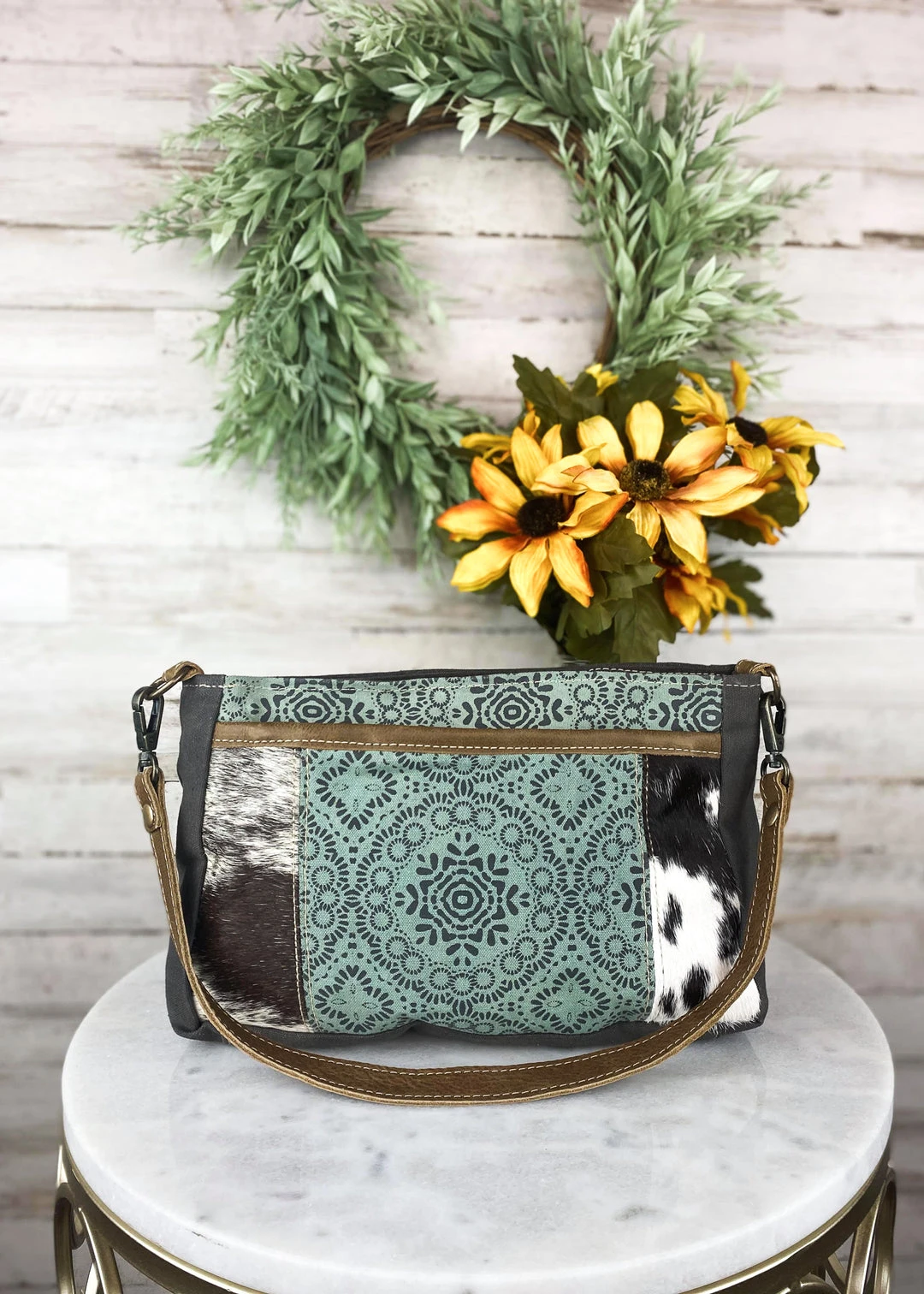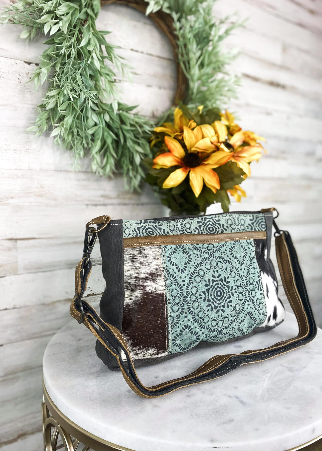 - Enjoy hassle-free shopping with secure payment options and fast, reliable shipping. Add the Myra Teal Pattern Cowhide Crossbody Handbag to your collection today!