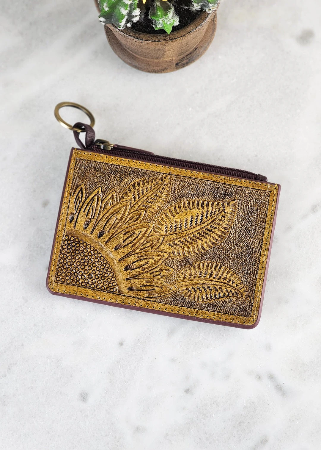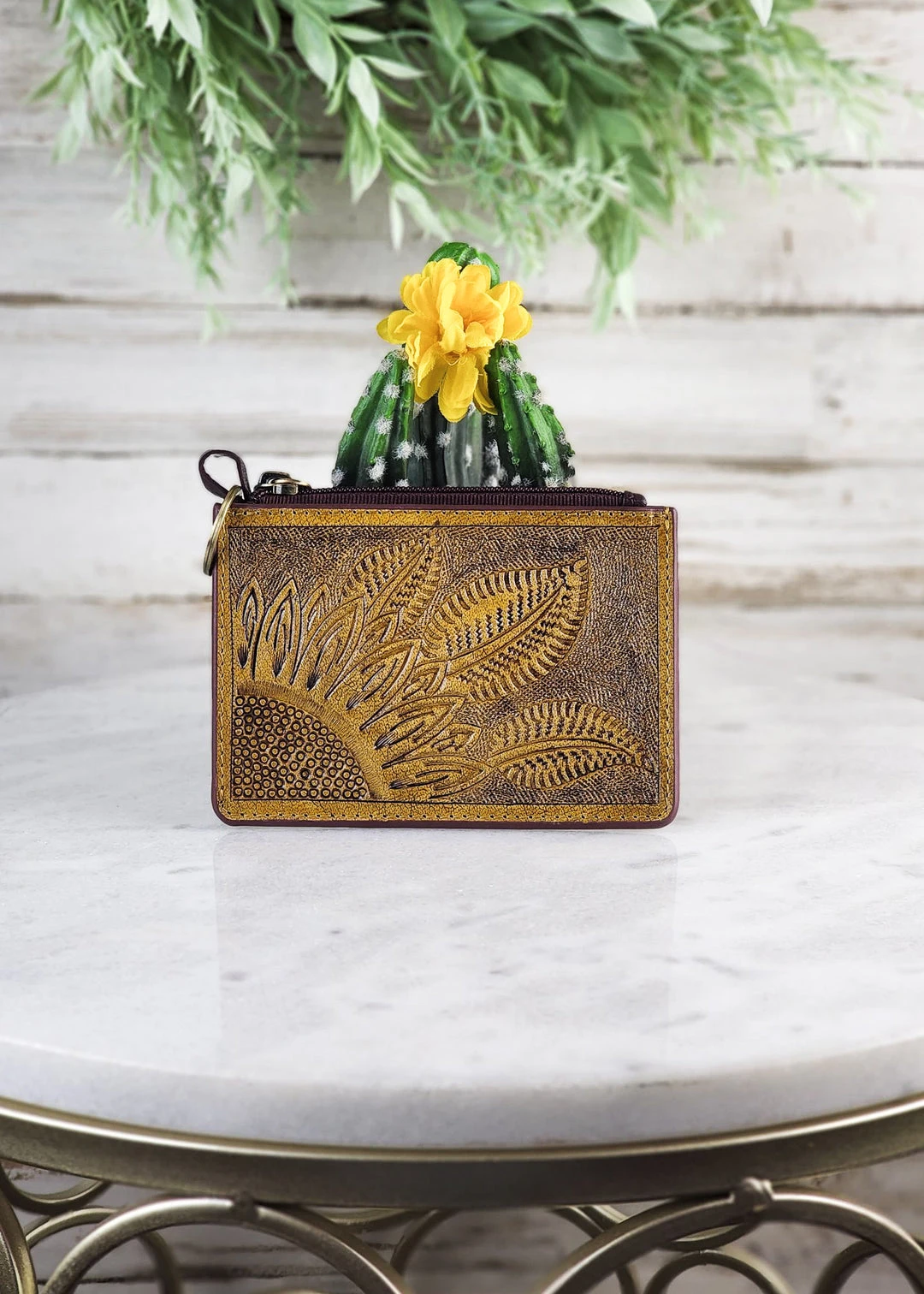 - The Myra Tooled Sunflower Card Holder features a beautifully tooled sunflower design, adding a touch of elegance to your everyday essentials.