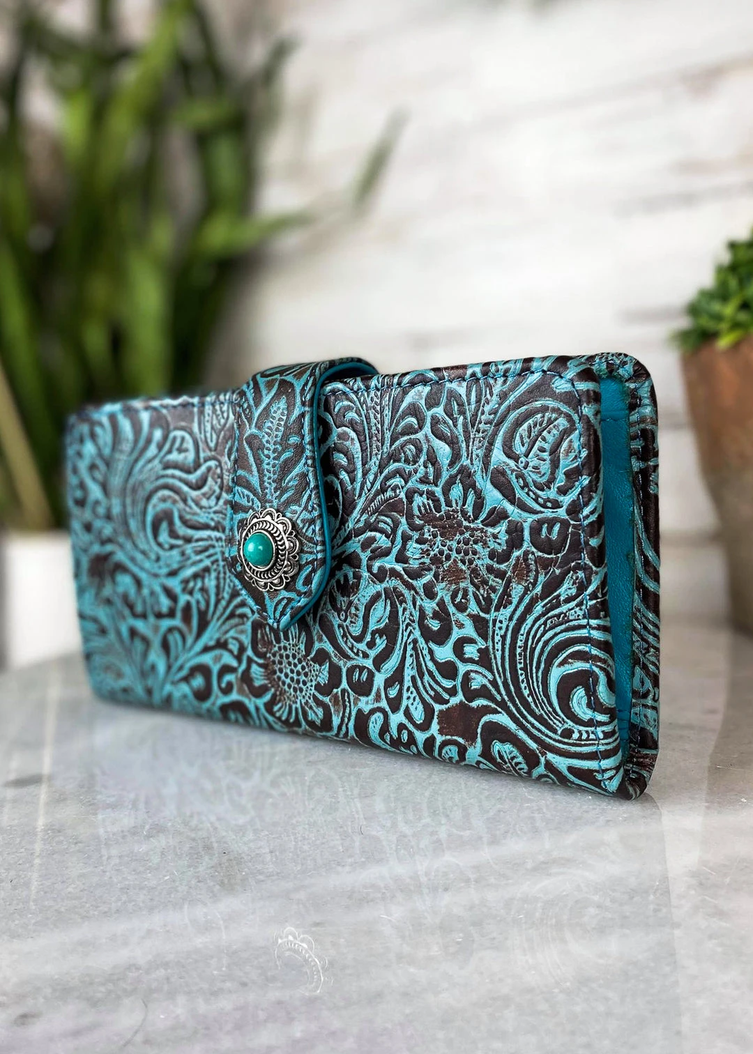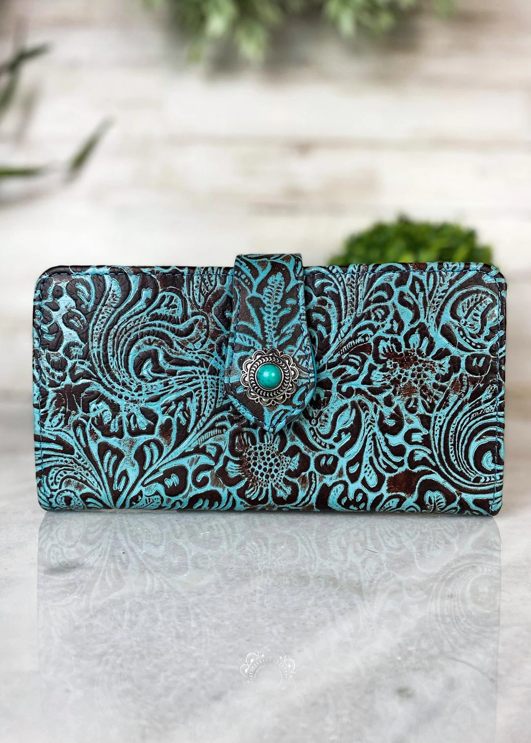 - Crafted with precision, the Myra Turquoise Floral Tooled Leather Wallet combines timeless design with modern functionality. Its intricate floral tooling adds a touch of elegance to your everyday essentials.