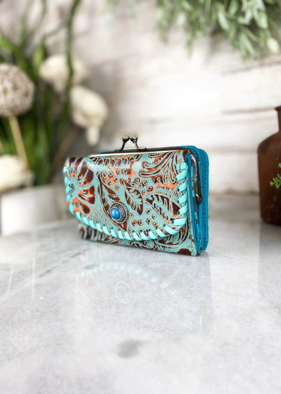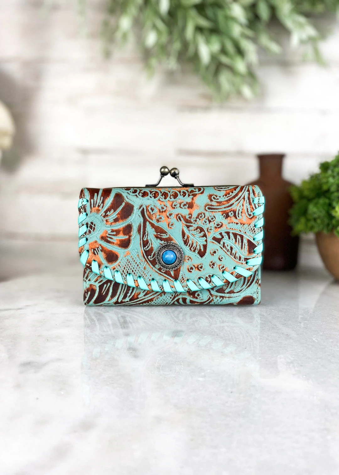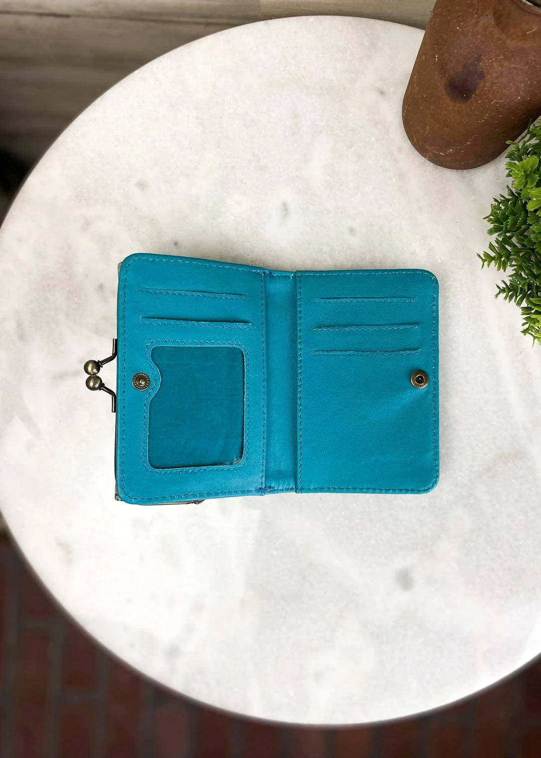 - Enhance your style with the Myra Turquoise Petals Vintage Small Wallet, featuring a unique turquoise petal design and vintage charm.