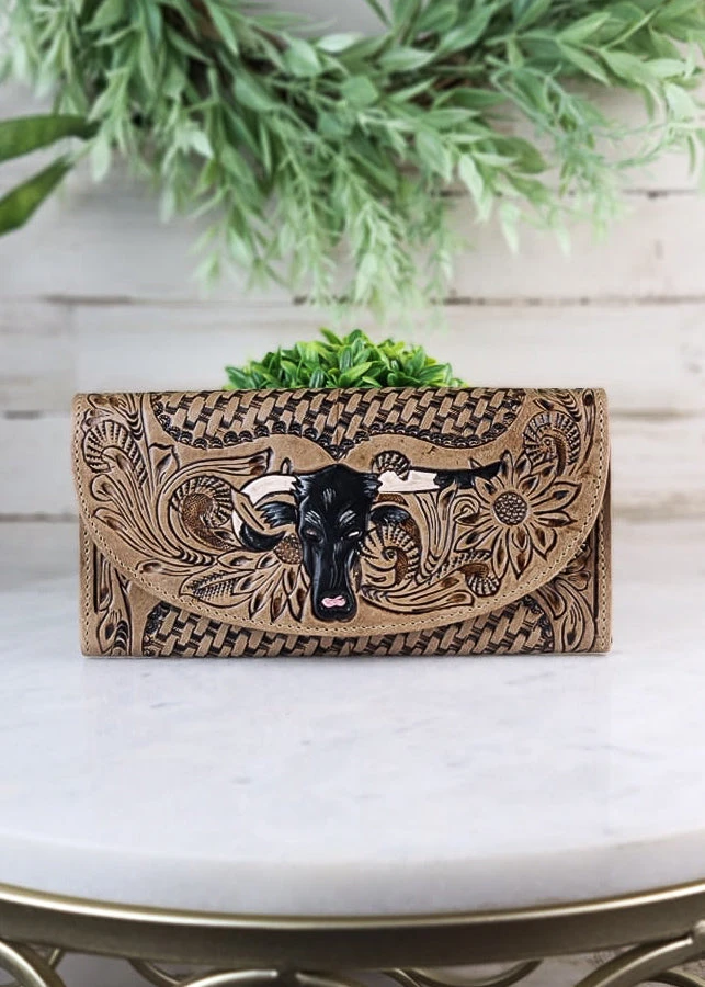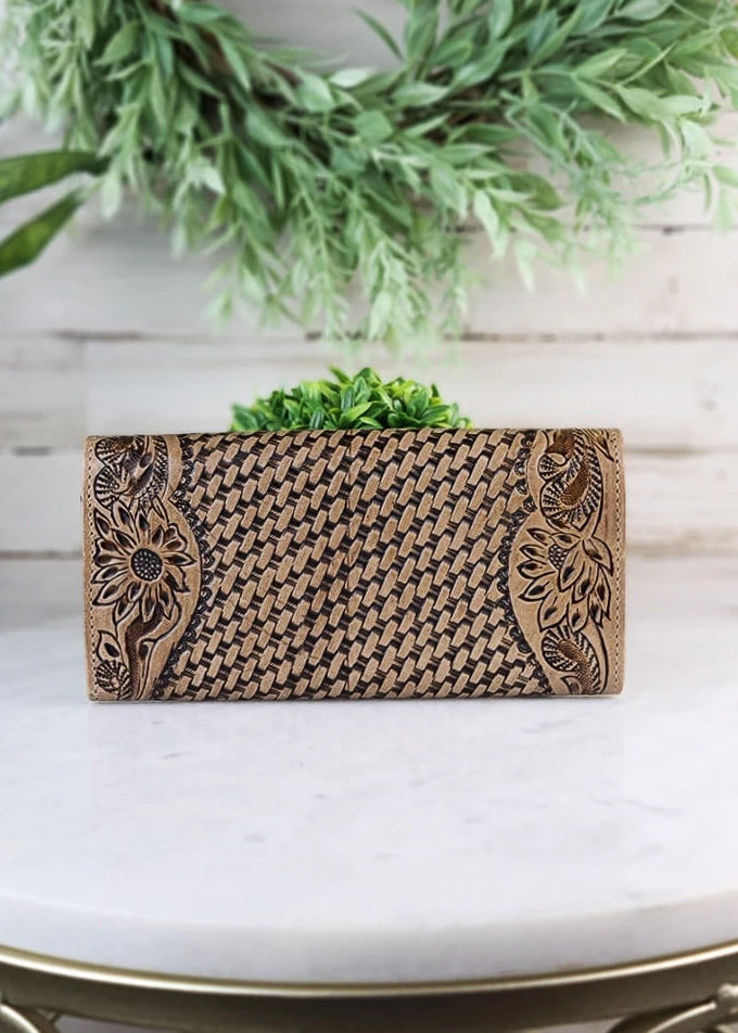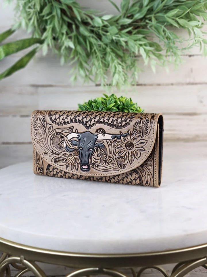 - Handcrafted with premium leather, the Myra Vara Western Tooled Wallet features intricate tooling for a unique Western-inspired design.
