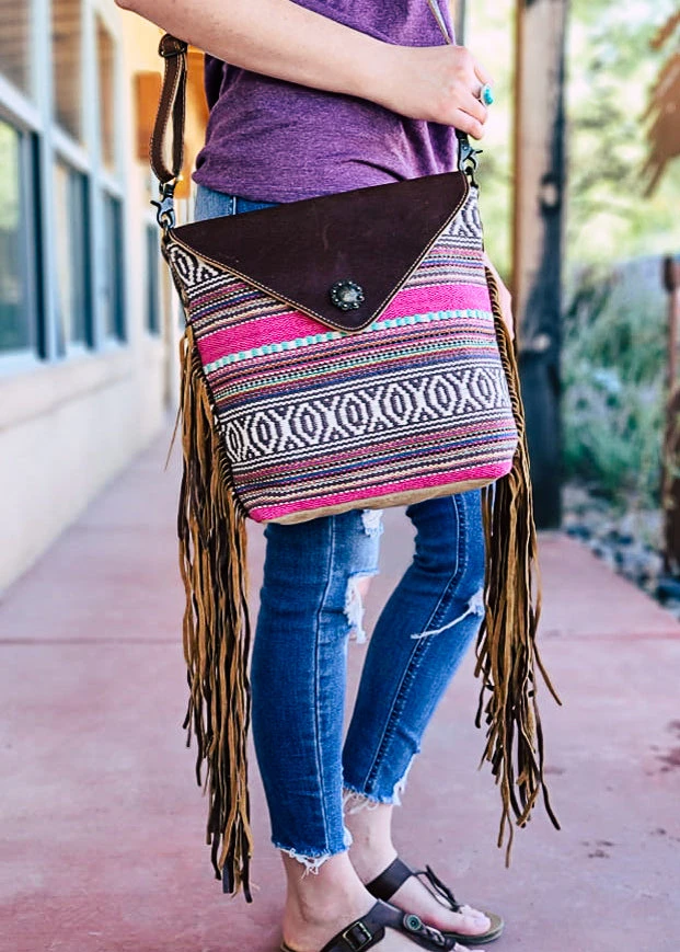 - Elevate your style with the Myra Vibrant Pattern Crossbody Shoulder Bag. Featuring a bold and eye-catching design, this bag is perfect for adding a pop of color to any outfit.
