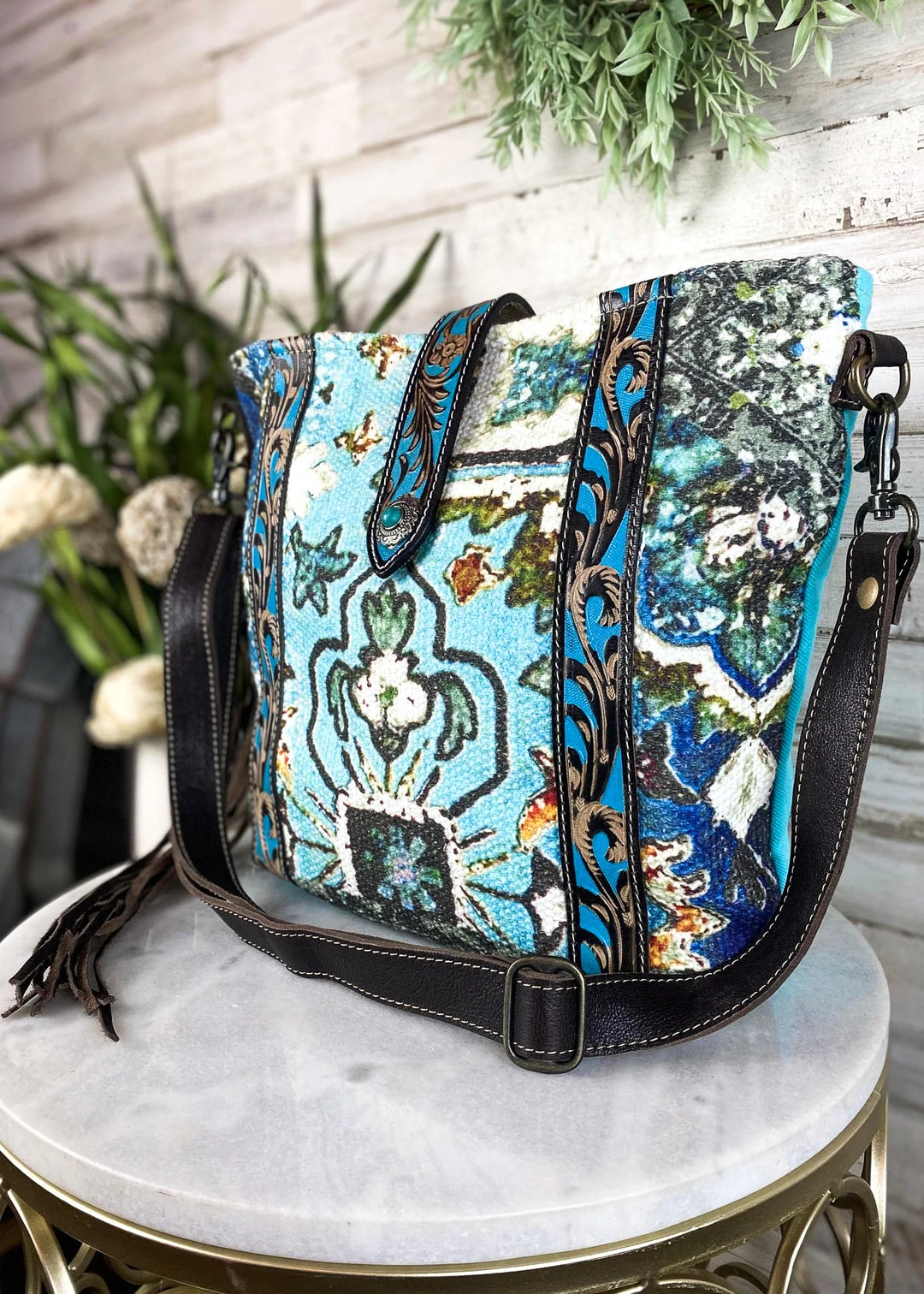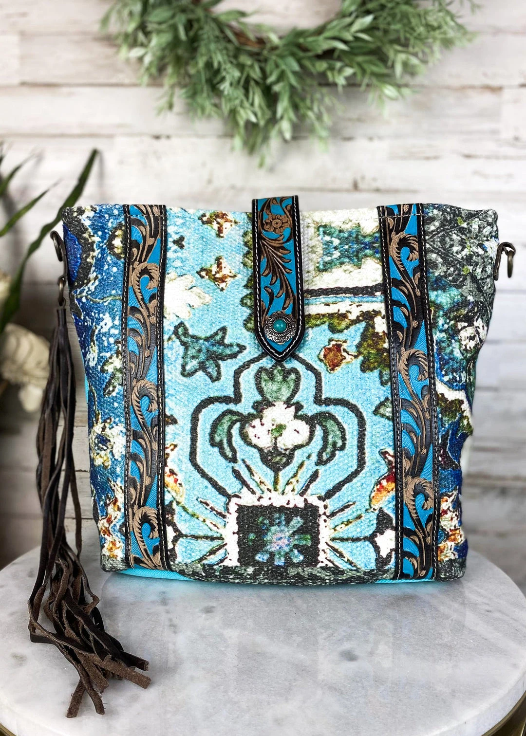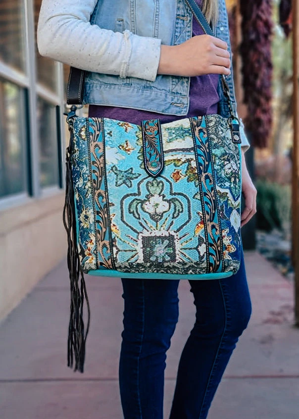 - Elevate your style with the Myra Vintage Mural & Floral Tooled Crossbody Handbag. Featuring intricate floral and mural designs, this handbag is a perfect blend of vintage charm and modern functionality.