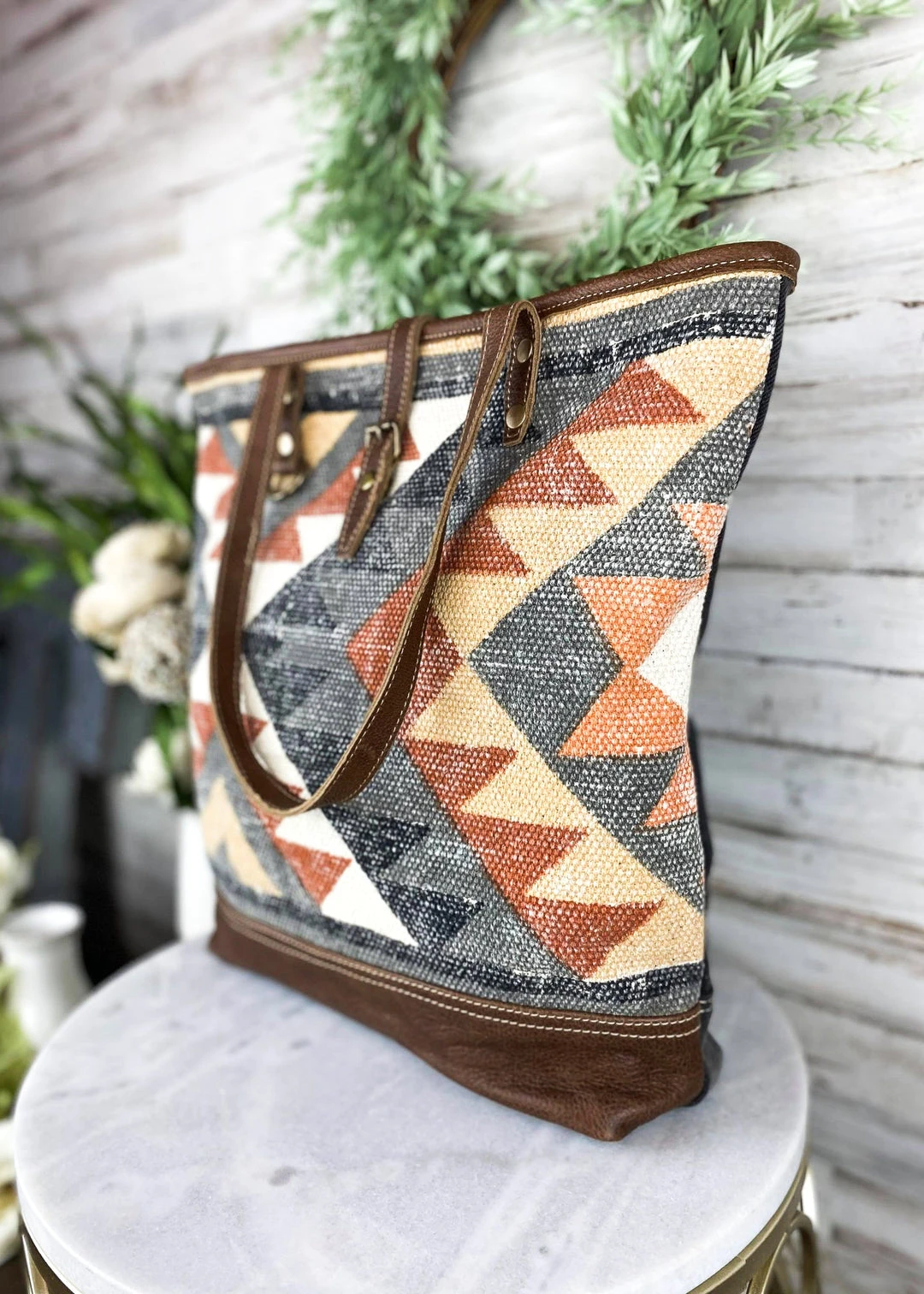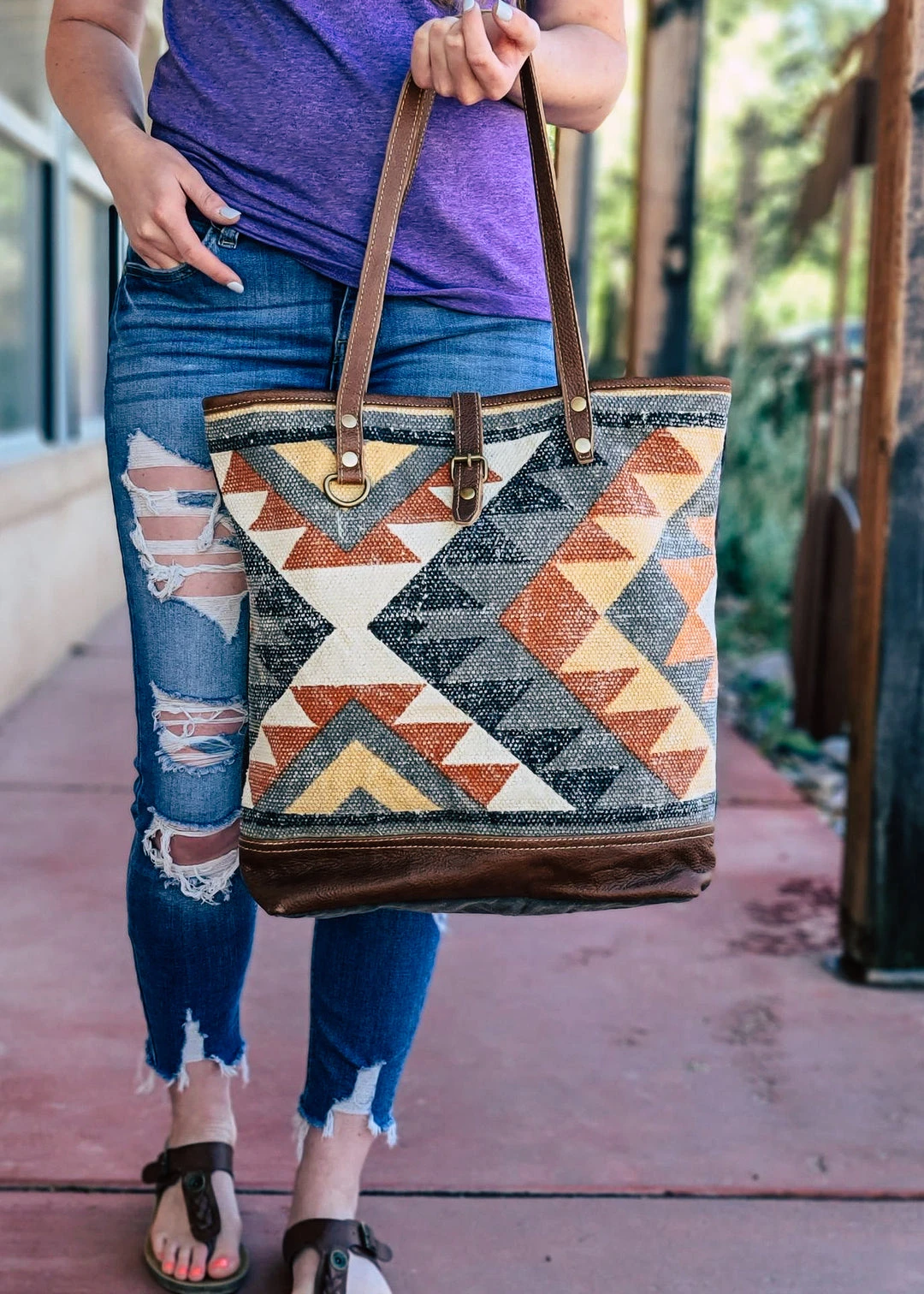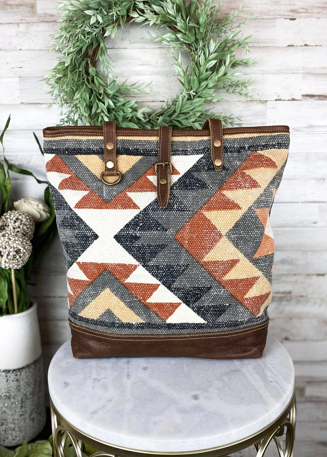 - The Myra Warm Aztec Canvas Tote Handbag combines style and functionality with its eye-catching Aztec design and high-quality canvas material, making it a versatile accessory for any outfit.