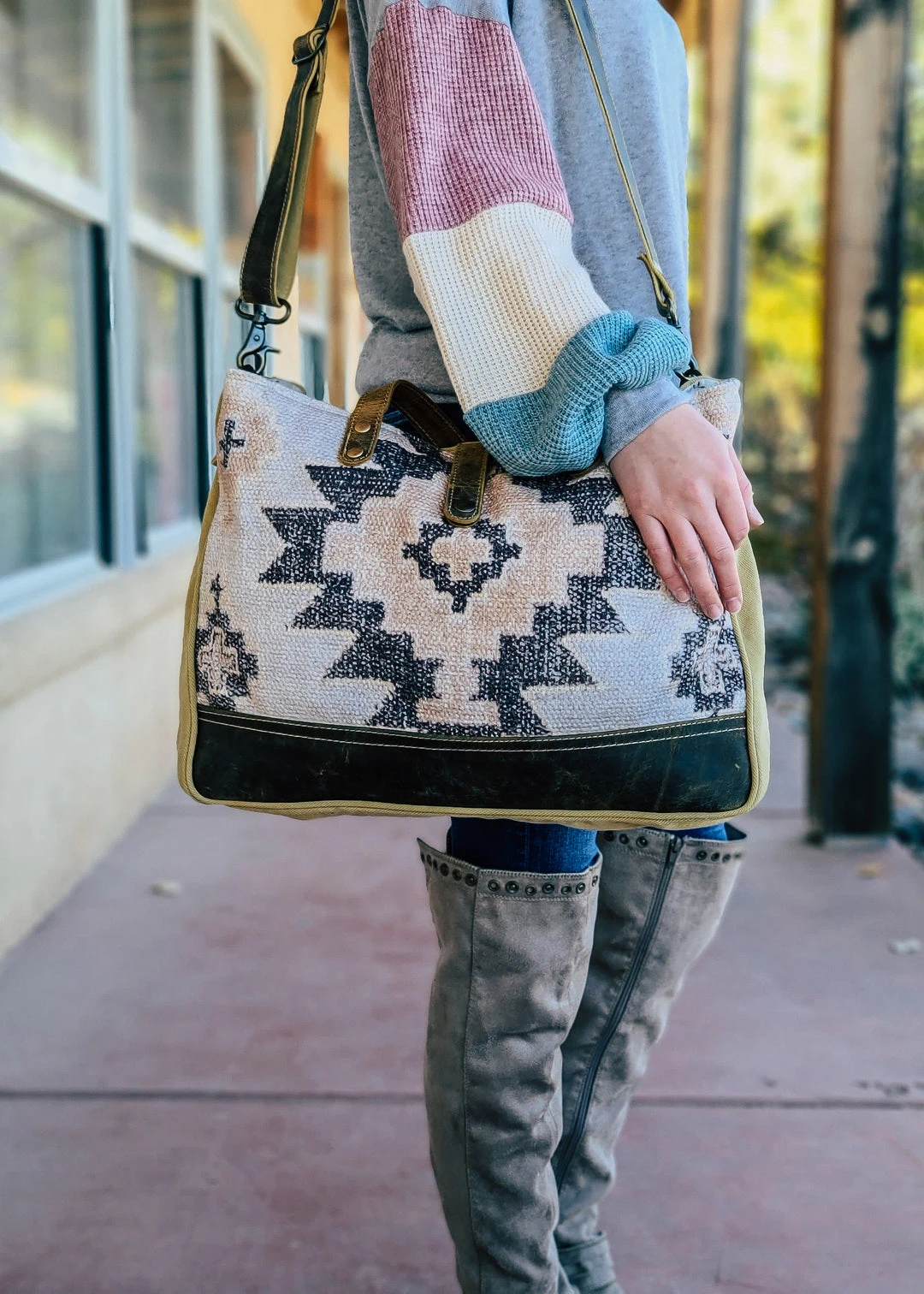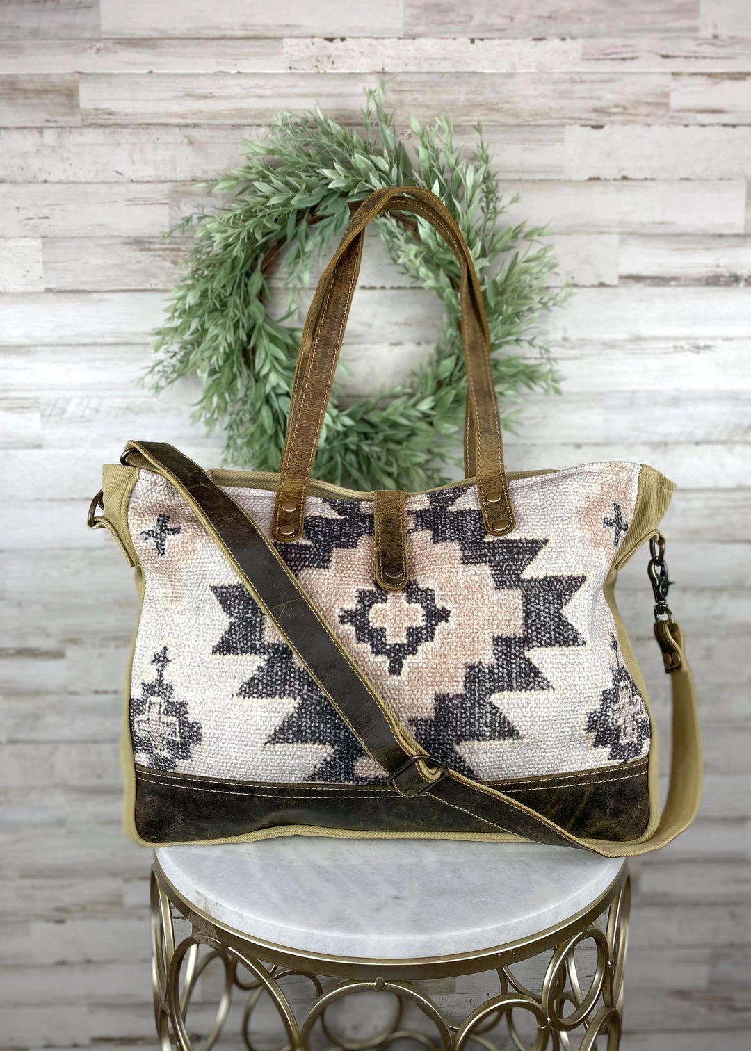 - Elevate your style with the Myra Weekender Handbag, featuring a stunning Tan and Pastel Pink Aztec design. Ideal for any occasion, it combines fashion with practicality.