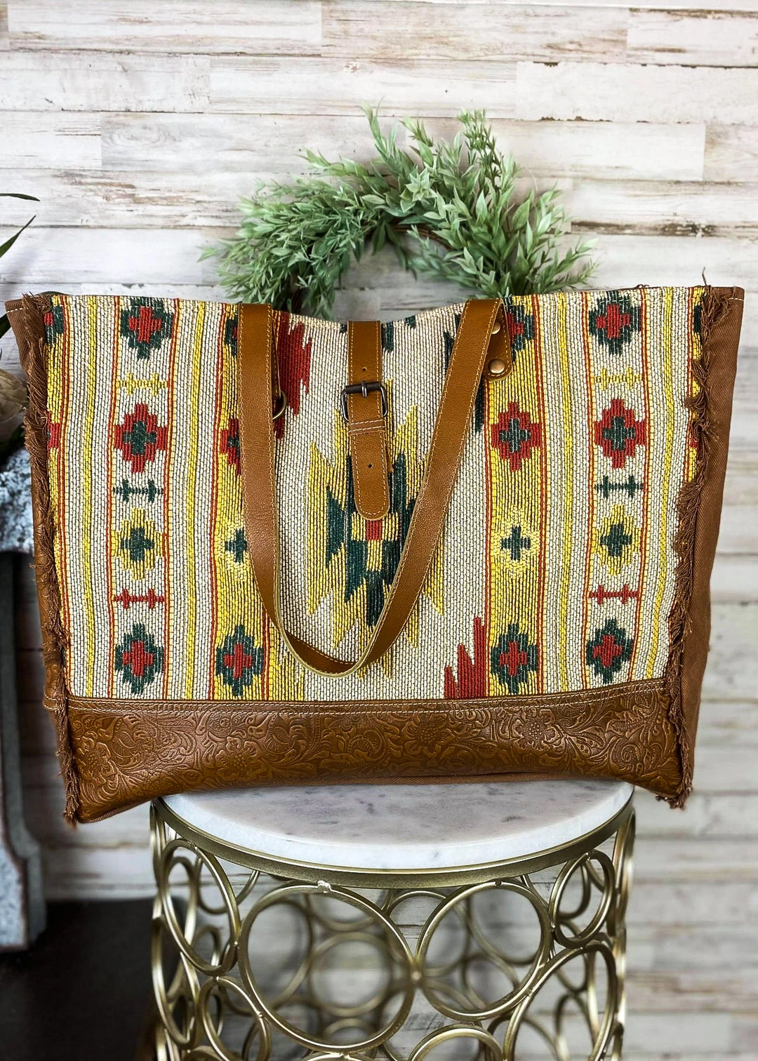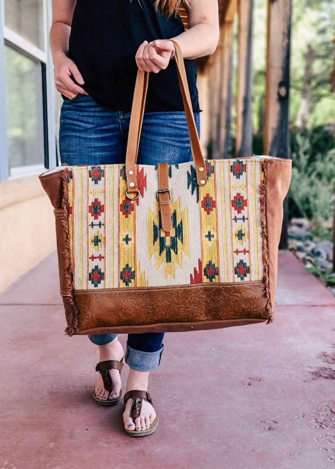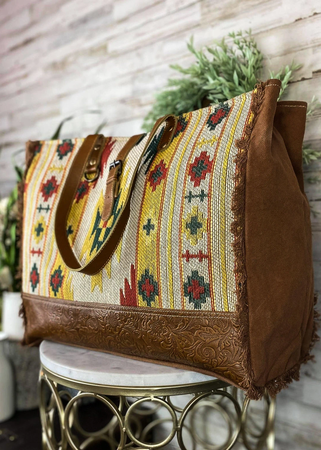 - Shop with confidence! Enjoy fast and reliable shipping, secure payment options, and a hassle-free return policy. Elevate your style with the Myra Western Aztec & Floral Tooled Weekender Bag today!