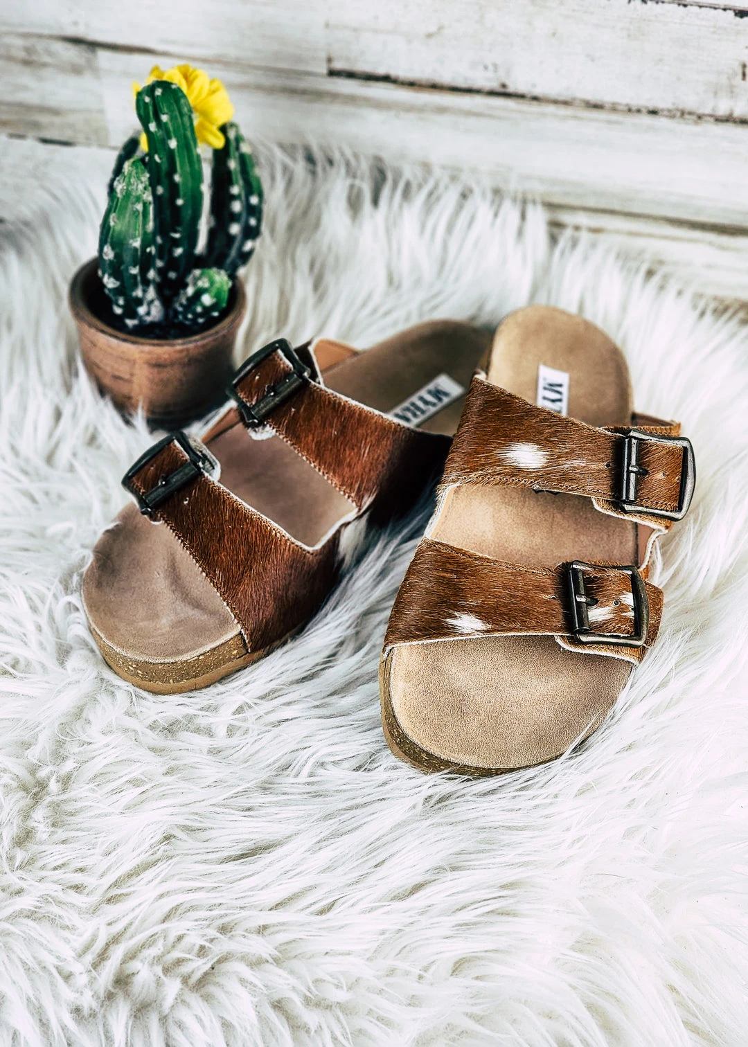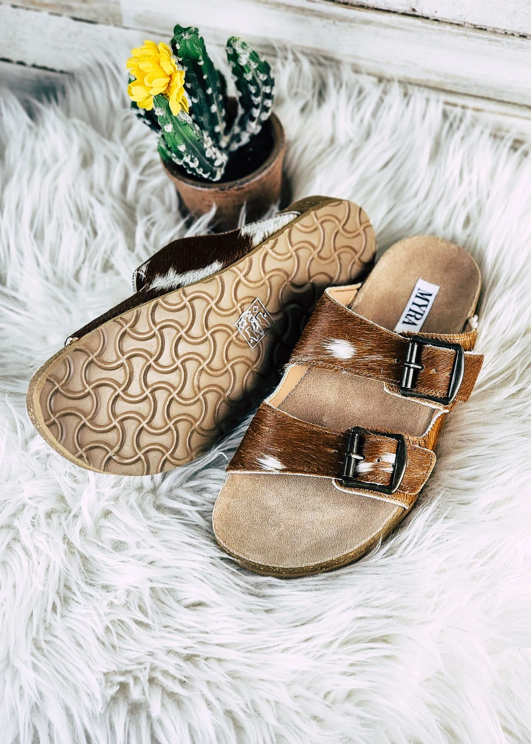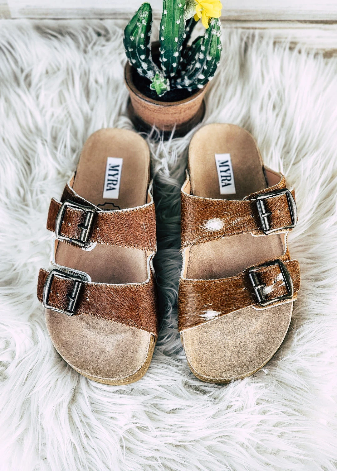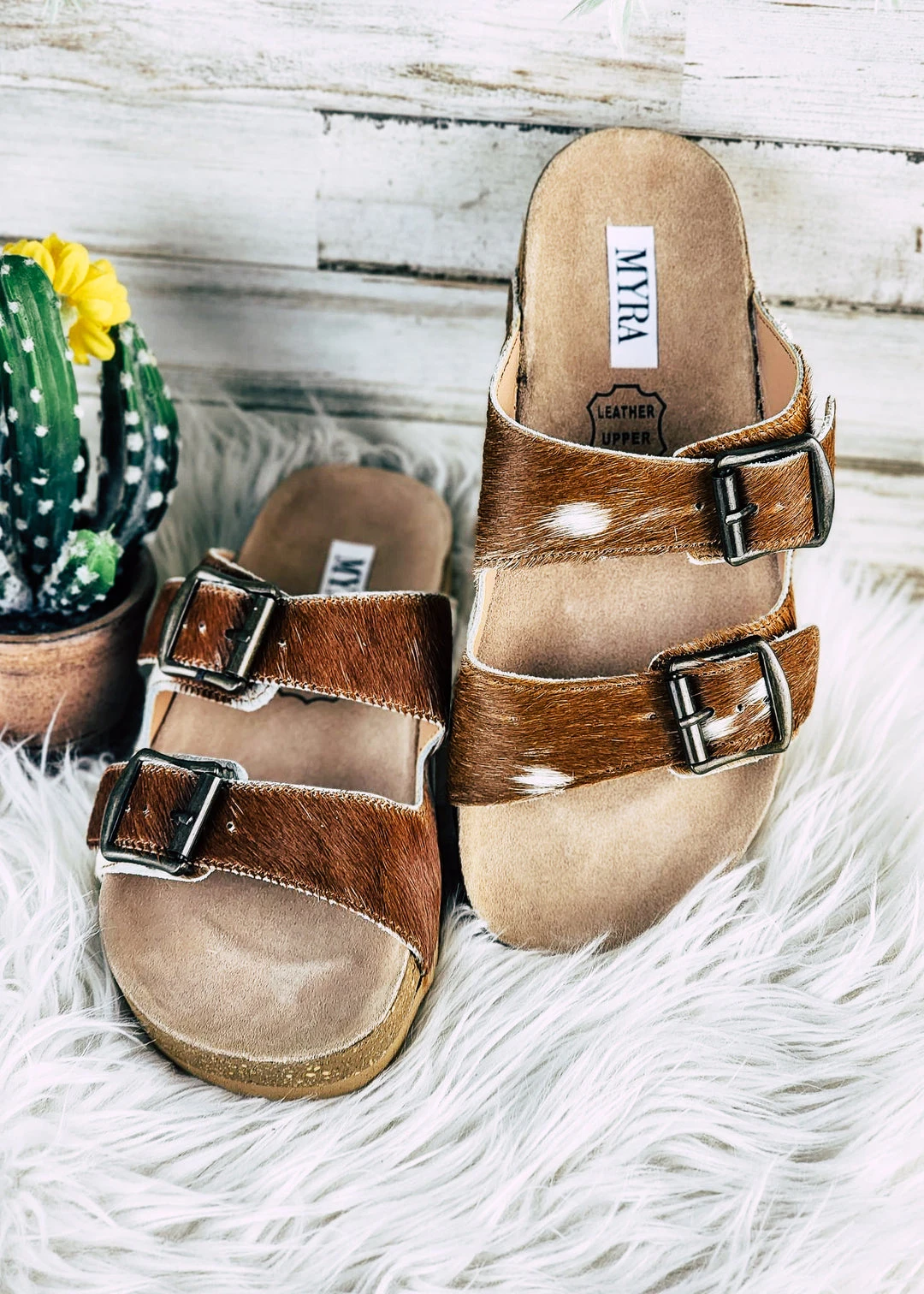 - Elevate your style with the Myra Winslow Brown & White Cowhide Sandals. These sandals feature a unique blend of brown and white cowhide, offering a chic and sophisticated look.