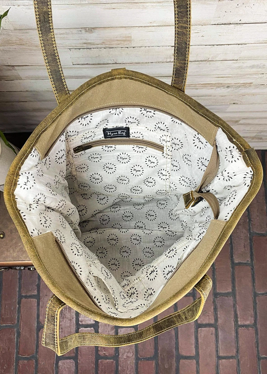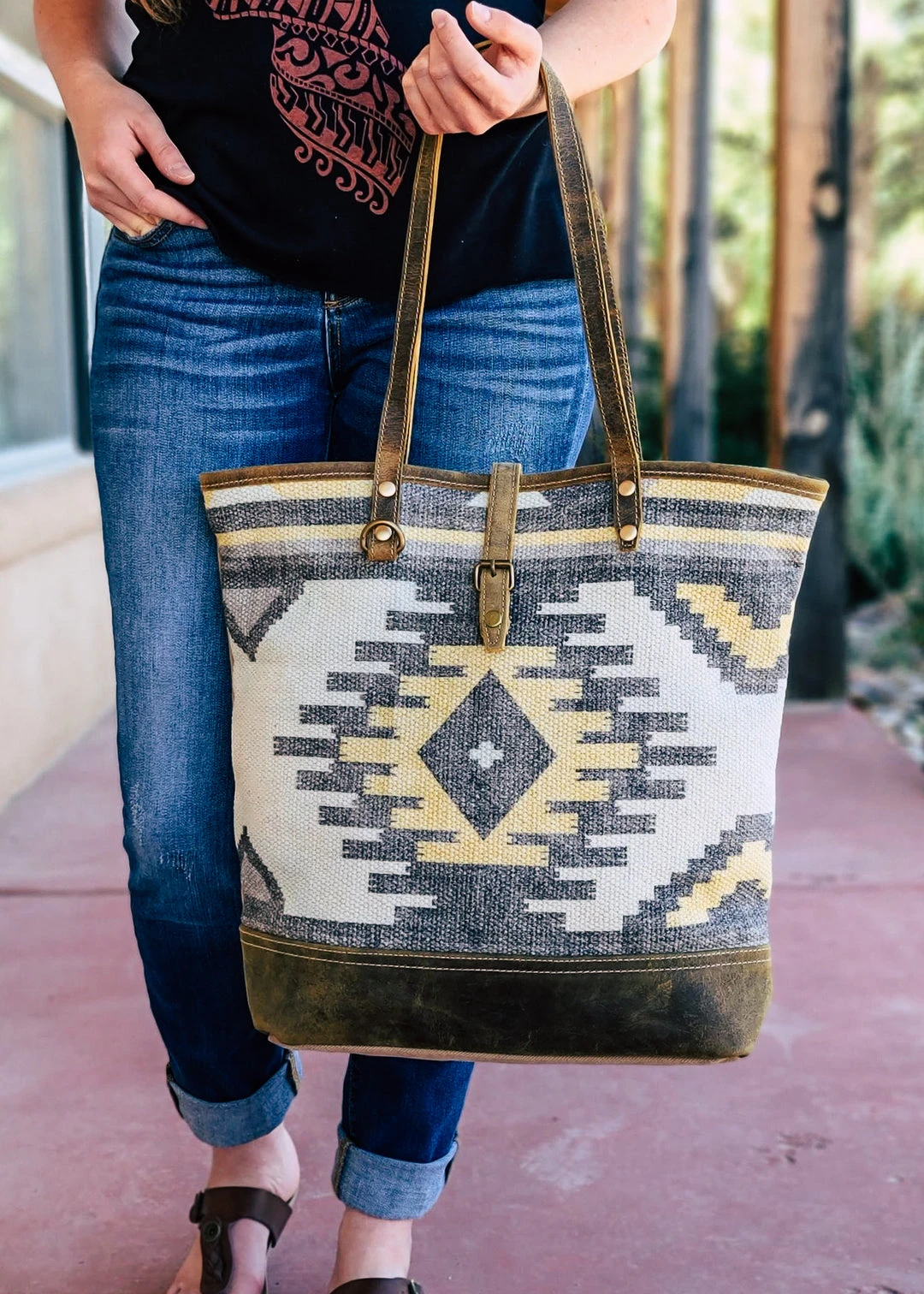 - The Myra Yellow Aztec & Leather Tote Handbag combines bold Aztec patterns with premium leather accents, offering a trendy and versatile accessory for any outfit.