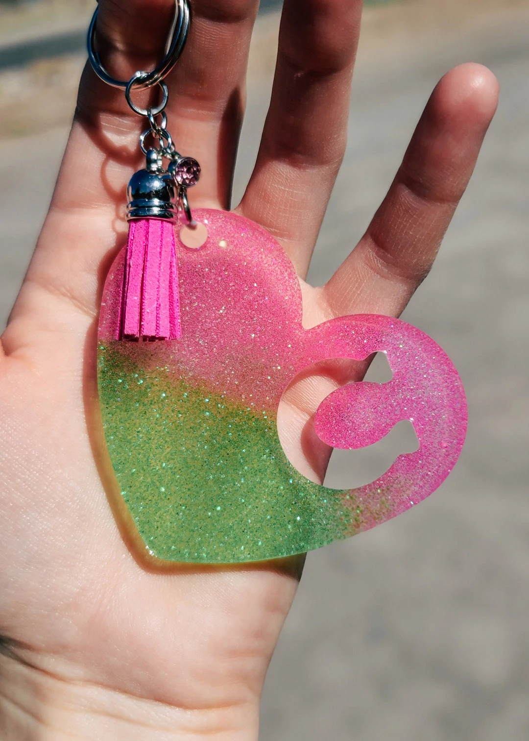 - Add a touch of cowgirl charm with our Pink & Lime Green Horseshoe Heart Keychain. Featuring a vibrant pink tassel, this keychain is a must-have accessory.
