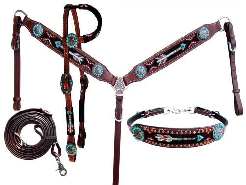 4 Piece beaded arrow headstall and breast collar set. This set features medium leather with a beaded arrow design inlay and is accented with turquoise stone arrow conchos. This set comes with single ear headstall, breast collar, wither strap and contest reins.Β