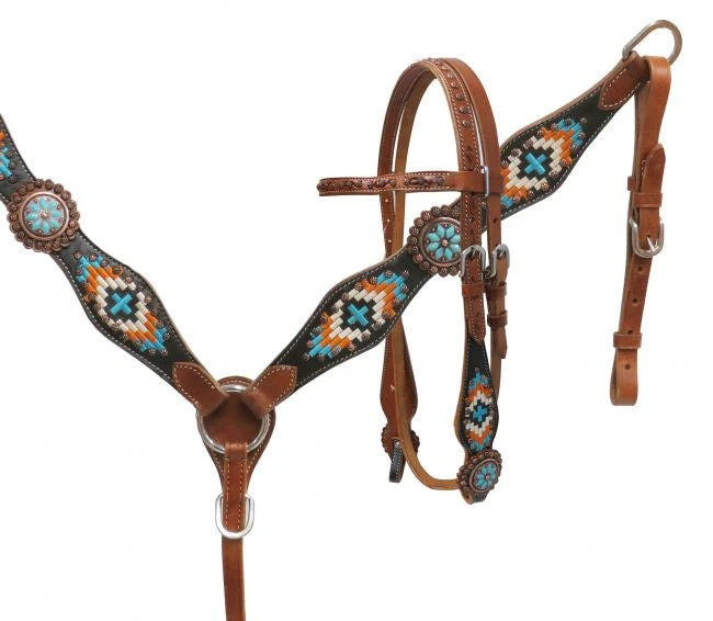 - Crafted with premium leather, the Shiloh Navajo Embroidered Headstall Set ensures durability and comfort for your horse.