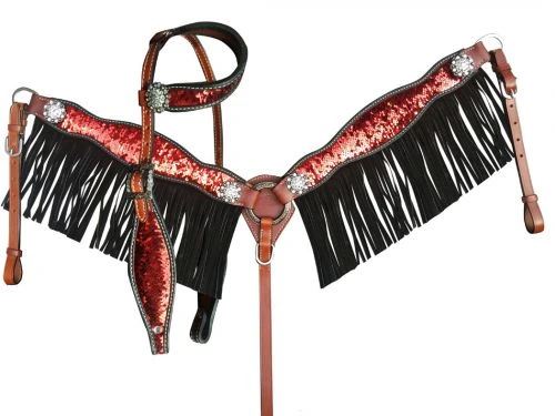 - Elevate your horse’s look with the Shiloh Red & Gold Sequin Headstall Set, a perfect blend of style and functionality for any equestrian event.