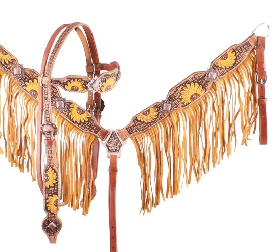 Hand Painted Sunflower Browband Headstall and Breastcollar Set with Fringe. This set features a medium colored leather with hand painted sunflowers throughout and a antiqued basketweave background. Breastcollar has mustard suede leather fringe and whole set is accented with copper conchos. Set comes complete with 5/8″ x 7′ split leather reins.
