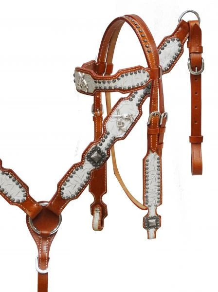 Embossed leather headstall and breast collar set with crossed guns conchos. This headstall and breast collar set features medium leather with a white overlay with embossed design and are accented with crossed gun conhchos and small flower studs. Headstall comes with 5/8″ x 7′ leather split reins.