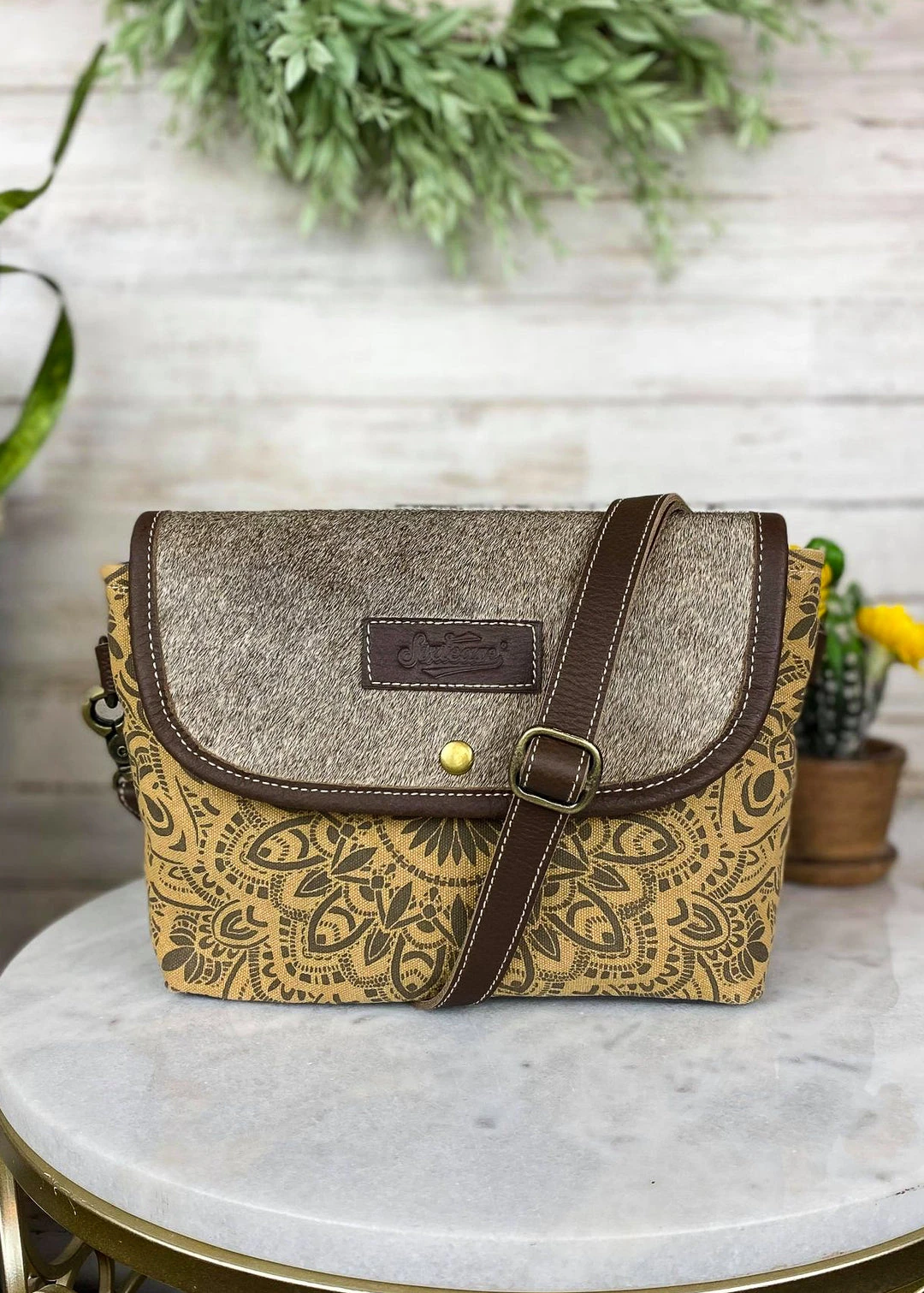 - Elevate your style with the Sixtease Antique Floral & Cowhide Crossbody Handbag. This handbag combines vintage floral patterns with durable cowhide leather for a unique and timeless look.